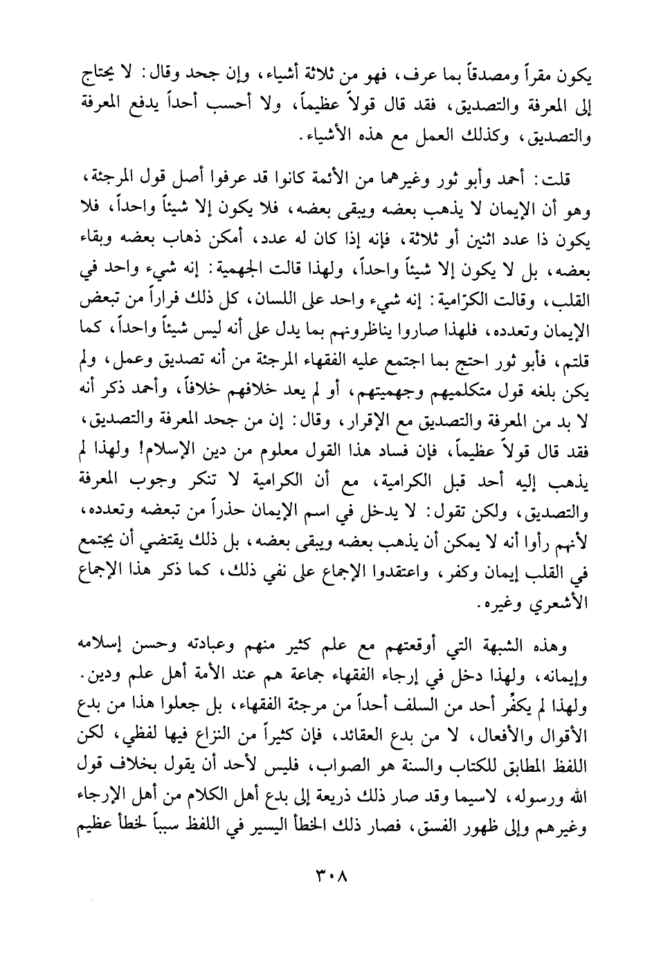 قلت: أحمد وأبو ثور وغيرهما من الأئمة كانوا قد عرفوا أصل قول المرجئة، وهو: أن الإيمان لا يذهب بعضه ويبقى بعضه، فلا يكون إلا شيئًا واحدًا فلا يكون ذا عدد؛ اثنين أو ثلاثة، فإنه إذا كان له عدد، أمكن ذهاب بعضه وبقاء بعضه، بل لا يكون إلا شيئًا واحدًا، ولهذا قالت الجهمية: إنه شيء واحد في القلب. وقالت الكرامية: إنه شيء واحد على اللسان، كل ذلك فرارًا من تبعض الإيمان وتعدده، فلهذا صاروا يناظرونهم بما يدل على أنه ليس شيئًا واحدًا، كما قلتم، فأبو ثور احتج بما اجتمع عليه الفقهاء المرجئة، من أنه تصديق وعمل، ولم يكن بلغه قول متكلميهم وجهميتهم، أو لم يعد خلافهم خلافًا، وأحمد ذكر أنه لابد من المعرفة والتصديق مع الإقرار، وقال: إن من جحد المعرفة والتصديق فقد قال قولاً عظيمًا، فإن فساد هذا القول معلوم من دين الإسلام؛ ولهذا لم يذهب إليه أحد قبل الكرامية، مع أن الكرامية لا تنكر وجوب المعرفة والتصديق، ولكن تقول: لا يدخل في اسم الإيمان حذرًا من تبعضه وتعدده؛ لأنهم رأوا أنه لا يمكن أن يذهب بعضه ويبقى بعضه، بل ذلك يقتضي أن يجتمع في القلب إيمان وكبر، واعتقدوا الإجماع على نفي ذلك، كما ذكر هذا الإجماع الأشعري وغيره.