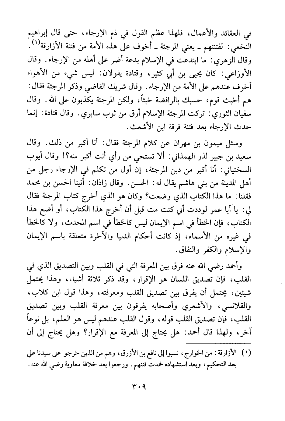 في العقائد والأعمال، فلهذا عظم القول في ذم الإرجاء، حتى قال إبراهيم النَّخَعِيّ: لفتنتهم يعني المرجئة أخوف على هذه الأمة من فتنة الأزارقة. وقال الزهري: ما ابتدعت في الإسلام بدعة أضر على أهله من الإرجاء، وقال الأوزاعي: كان يحيى بن أبي كثير وقتادة يقولان: ليس شيء من الأهواء أخوف عندهم على الأمة من الإرجاء، وقال شريك القاضي وذكر المرجئة فقال: هم أخبث قوم، حسبك بالرافضة خبثًا، ولكن المرجئة يكذبون على الله. وقال سفيان الثوري: تركت المرجئة الإسلام أرق من ثوب سابِرِيّ وقال قتادة: إنما حدث الإرجاء بعد فتنة فرقة ابن الأشعث.