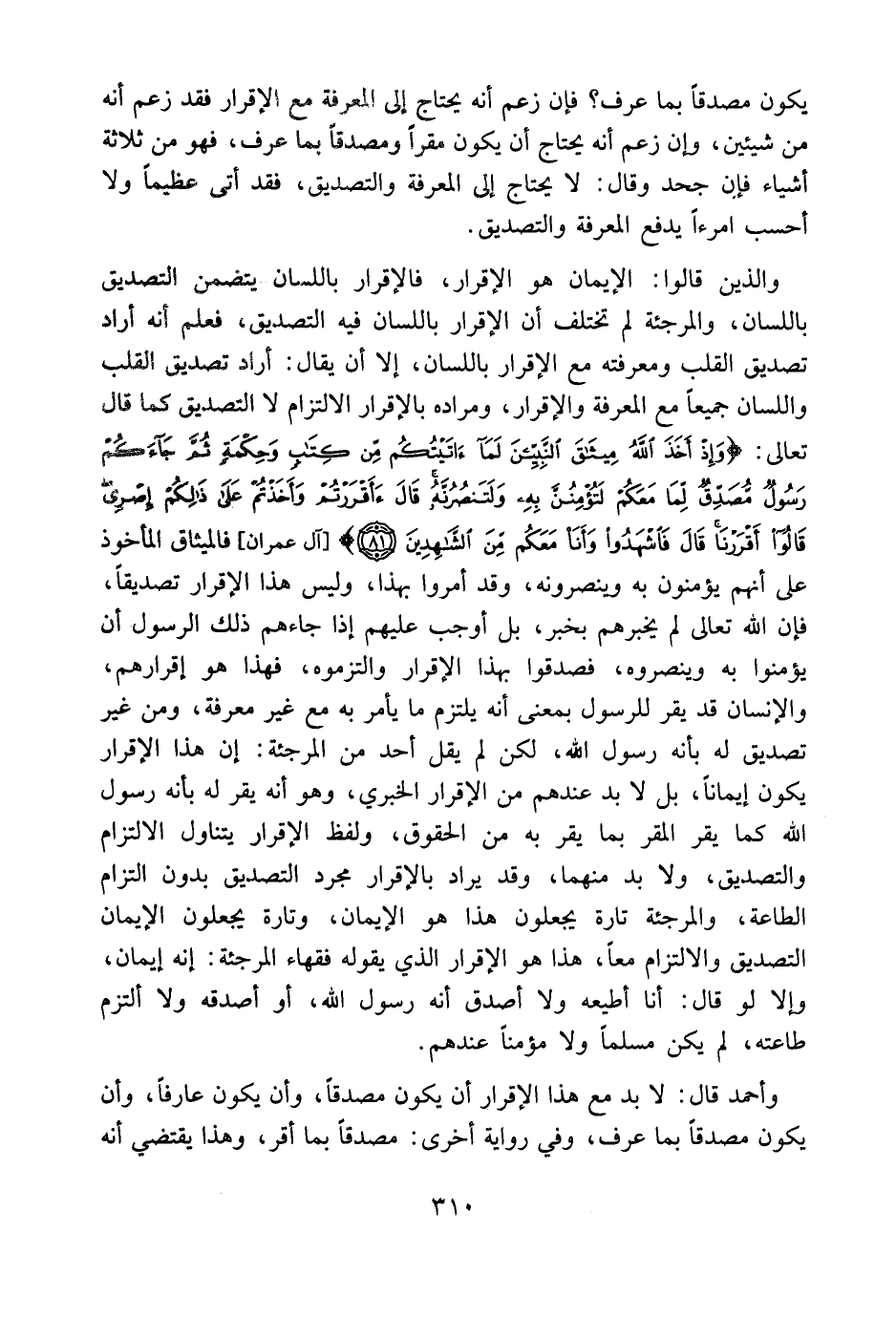 والذين قالوا: الإيمان هو الإقرار. فالإقرار باللسان يتضمن التصديق باللسان. والمرجئة لم تختلف أن الإقرار باللسان فيه التصديق، فعلم أنه أراد تصديق القلب ومعرفته مع الإقرار باللسان، إلا أن يقال: أراد تصديق القلب واللسان جميعًا مع المعرفة والإقرار، ومراده بالإقرار الالتزام لا التصديق، كما قال تعالى: {وَإِذْ أَخَذَ اللهُ مِيثَاقَ النَّبِيِّيْنَ لَمَا آتَيْتُكُم مِّن كِتَابٍ وَحِكْمَةٍ ثُمَّ جَاءكُمْ رَسُولٌ مُّصَدِّقٌ لِّمَا مَعَكُمْ لَتُؤْمِنُنَّ بِهِ وَلَتَنصُرُنَّهُ قَالَ أَأَقْرَرْتُمْ وَأَخَذْتُمْ عَلَى ذَلِكُمْ إِصْرِي قَالُواْ أَقْرَرْنَا قَالَ فَاشْهَدُواْ وَأَنَاْ مَعَكُم مِّنَ الشَّاهِدِينَ} [آل عمران: 81] ، فالميثاق المأخوذ على أنهم يؤمنون به وينصرونه، وقد أمروا بهذا، وليس هذا الإقرار تصديقًا، فإن الله تعالى لم يخبرهم بخبر، بل أوجب عليهم إذا جاءهم ذلك الرسول أن يؤمنوا به وينصروه. فصدقوا بهذا الإقرار والتزموه، فهذا هو إقرارهم. والإنسان قد يقر للرسول، بمعنى: أنه يلتزم ما يأمر به مع غير معرفة، ومن غير تصديق له بأنه رسول الله، لكن لم يقل أحد من المرجئة: إن هذا الإقرار يكون إيمانًا، بل لابد عندهم من الإقرار الخبري وهو أنه يقر له بأنه رسول الله كما يقر المقر بما يقر به من الحقوق، ولفظ الإقرار يتناول الالتزام والتصديق، ولابد منهما، وقد يراد بالإقرار مجرد التصديق بدون التزام الطاعة، والمرجئة تارة يجعلون هذا هو الإيمان وتارة يجعلون الإيمان التصديق والالتزام معًا، هذا هو الإقرار الذي يقوله فقهاء المرجئة: إنه إيمان، وإلا لو قال: أنا أطيعه ولا أصدق أنه رسول الله، أو أصدقه ولا ألتزم طاعته، لم يكن مسلمًا ولا مؤمنًا عندهم.