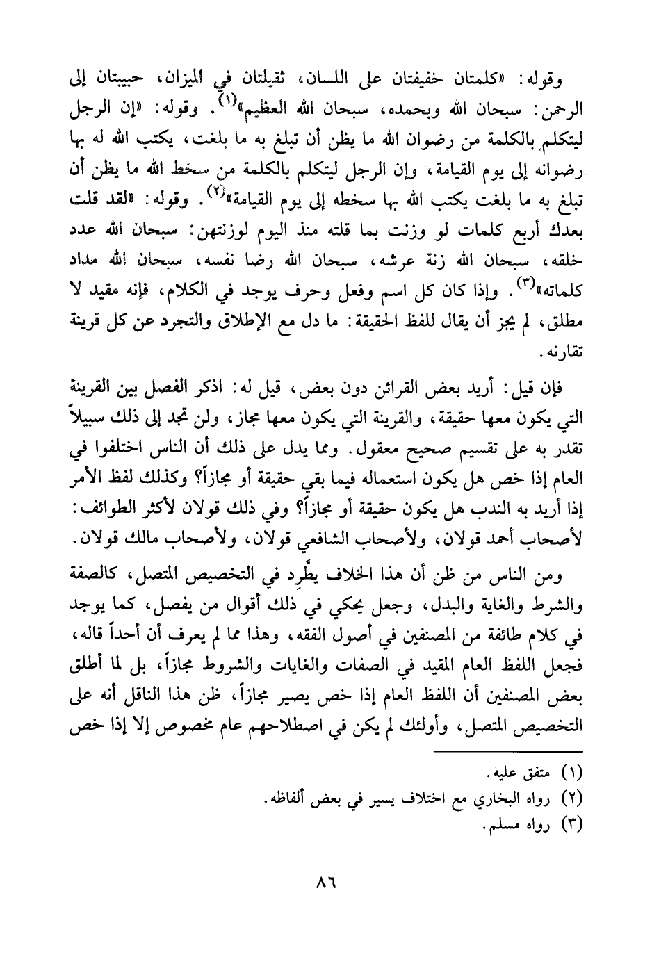 وقوله: " كلمتان خفيفتان على اللسان ثقيلتان في الميزان حبيبتان إلى الرحمن سبحان الله وبحمده سبحان الله العظيم "، وقوله: " ان الرجل ليتكلم بالكلمة من رضوان الله ما يظن أن تبلغ به ما بلغت يكتب الله له بها رضوانه إلى يوم القيامة وإن الرجل ليتكلم بالكلمة من سخط الله ما يظن أن تبلغ به ما بلغت يكتب الله بها سخطه إلى يوم القيامة "، وقوله: " لقد قلت بعدك أربع كلمات لو وزنت بما قلته منذ اليوم لوزنتهن سبحان الله عدد خلقه سبحان الله زنة عرشه سبحان الله رضا نفسه سبحان الله مداد كلماته "، وإذا كان كل اسم أو فعل أو حرف يوجد في الكلام فإنه مقيد لا مطلق لم يجز أن يقال للفظ الحقيقة ما دل مع الإطلاق والتجرد عن كل قرينة تقارنه.