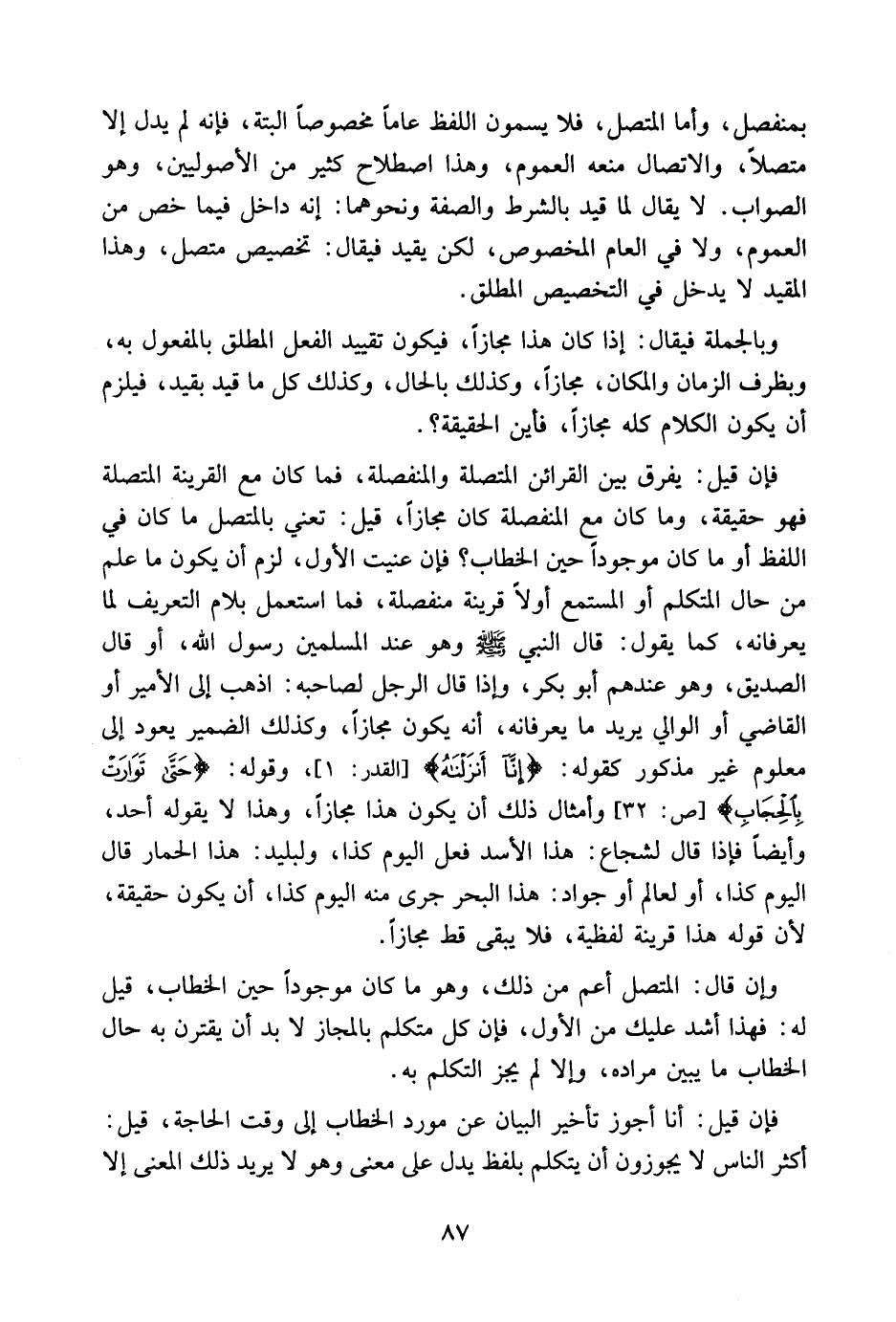 فان قيل: يفرق بين القرائن المتصلة والمنفصلة فما كان مع القرينة المتصلة فهو حقيقة، وما كان مع المنفصلة كان مجازا؛ قيل: تعنى بالمتصل ما كان في اللفظ أو ما كان موجودا حين الخطاب فان عنيت الأول لزم أن يكون ما علم من حال المتكلم أو المستمع أولا قرينة منفصلة فما استعمل بلام التعريف لما يعرفانه كما يقول قال النبي صلى الله عليه وسلم وهو عند المسلمين رسول الله أو قال الصديق، وهو عندهم أبو بكر وإذا قال الرجل لصاحبه: اذهب إلى الأمير أو القاضى أو الوالى يريد ما يعرفانه أنه يكون مجازا وكذلك الضمير يعود إلى معلوم غير مذكور كقوله: {إنا أنزلناه} [القدر: 1] ، وقوله: {حَتَّى تَوَارَتْ بِالْحِجَابِ} [ص: 32] ، وأمثال ذلك، أن يكون هذا مجازا وهذا لا يقوله أحد.