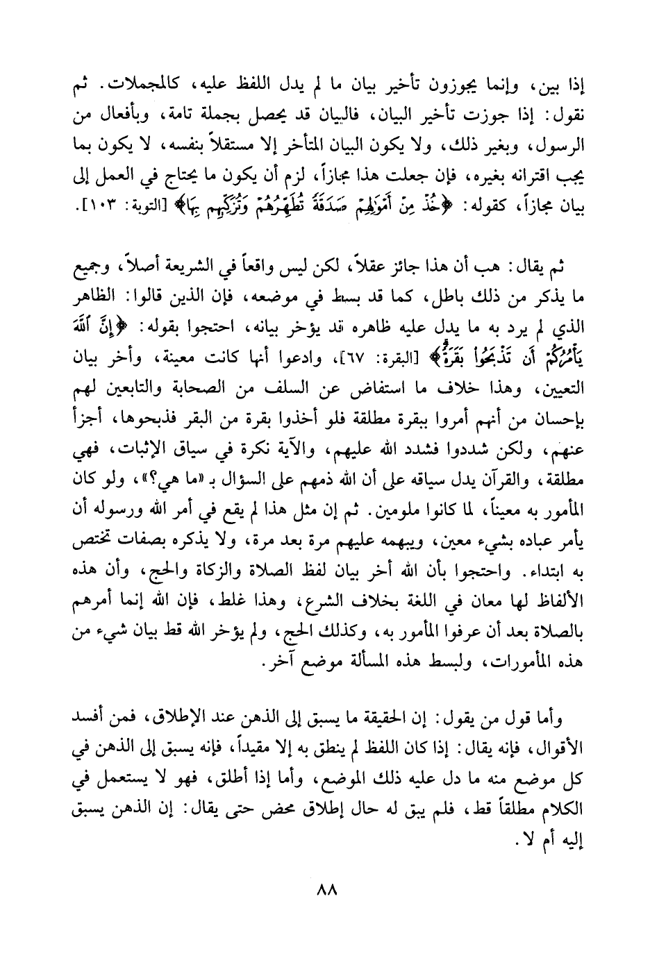 واحتجوا بأن الله أخر بيان لفظ الصلاة والزكاة والحج وان هذه الالفاظ لها معان في اللغة بخلاف الشرع وهذا غلط فان الله انما أمرهم بالصلاة بعد أن عرفوا المأمور به وكذلك الصيام، وكذلك الحج، ولم يؤخر الله قط بيان شىء من هذه المأمورات ولبسط هذه المسألة موضع آخر.