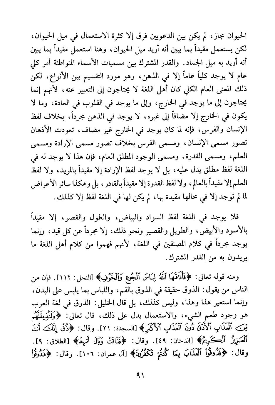 فلا يوجد في اللغة لفظ السواد والبياض والطول والقصر إلا مقيدا بالأسود والأبيض والطويل والقصير ونحو ذلك؛ لا مجردا عن كل قيد وإنما يوجد مجردا في كلام المصنفين في اللغة، لأنهم فهموا من كلام أهل اللغة ما يريدون به من القدر المشترك، ومنه قوله تعالى: {فَأَذَاقَهَا اللهُ لِبَاسَ الْجُوعِ وَالْخَوْفِ} [النحل: 112] ، فإن من الناس من يقول: الذوق حقيقة في