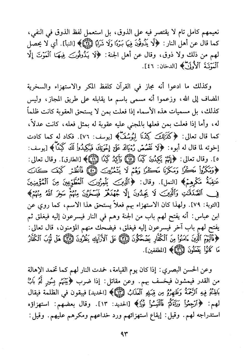 وكذلك ما ادعوا أنه مجاز في القرآن كلفظ المكر والاستهزاء والسخرية المضاف إلى الله وزعموا أنه مسمى باسم ما يقابله على طريق المجاز وليس كذلك بل مسميات هذه الأسماء إذا فعلت بمن لا يستحق العقوبة كانت ظلما له وأما إذا فعلت بمن فعلها بالمجنى عليه عقوبة له بمثل فعله كانت عدلا كما قال تعالى كذلك كدنا ليوسف فكاد له كما كادت اخوته لما قال له أبوه لا تقصص رؤياك على اخوتك فيكيدوا لك كيدا وقال تعالى: {إِنَّهُمْ يَكِيدُونَ كَيْدًا وَأَكِيدُ كَيْدًا} [الطارق: 15، 16] ، وقال تعالى: {وَمَكَرُوا مَكْرًاوَمَكَرْنَا مَكْرًا وَهُمْ لا يَشْعُرُونَ فَانظُرْ كَيْفَ كَانَ عَاقِبَةُ مَكْرِهِمْ} [النمل: 50، 51] ، وقال تعالى: {الَّذِينَ يَلْمِزُونَ الْمُطَّوِّعِينَ مِنَ الْمُؤْمِنِينَ فِي الصَّدَقَاتِ وَالَّذِينَ لاَ يَجِدُونَ إِلاَّ جُهْدَهُمْ فَيَسْخَرُونَ مِنْهُمْ سَخِرَ اللهُ مِنْهُمْ} [التوبة: 79] ، ولهذا كان الاستهزاء بهم فعلا يستحق هذا الاسم كما روى عن ابن عباس أنه يفتح لهم باب من الجنة وهم في النار فيسرعون اليه فيغلق ثم يفتح لهم باب آخر فيسرعون اليه فيغلق فيضحك منهم المؤمنون؛ قال تعالى: {فَالْيَوْمَ الَّذِينَ آمَنُواْ مِنَ الْكُفَّارِ يَضْحَكُونَ عَلَى الأَرَائِكِ يَنظُرُونَ هَلْ ثُوِّبَ الْكُفَّارُ مَا كَانُوا يَفْعَلُونَ} [المطففين: 34: 36] .