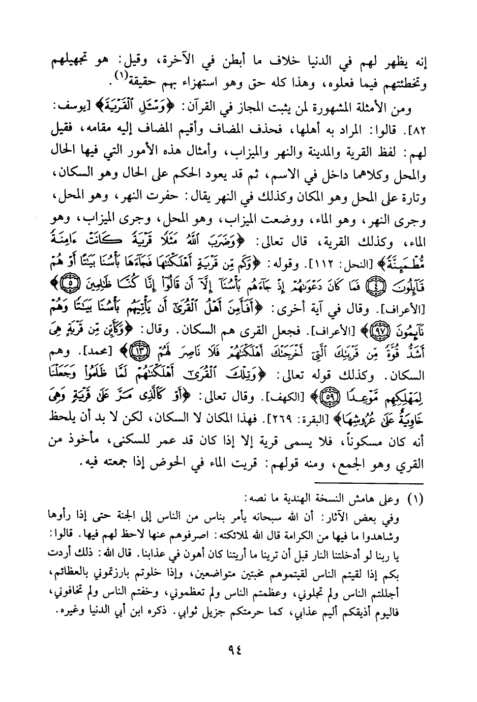 ومن الأمثلة المشهورة لمن يثبت المجاز في القرآن: {وَاسْأَلِ الْقَرْيَةَ} [يوسف: 82] ، قالوا المراد به أهلها فحذف المضاف وأقيم المضاف اليه مقامه فقيل لهم لفظ القرية والمدينة والنهر والميزاب وأمثال هذه الأمور التى فيها الحال والمحال كلاهما داخل في الاسم ثم قد يعود الحكم على الحال وهو السكان وتارة على المحل وهو المكان وكذلك في النهر يقال حفرت النهر وهو المحل وجرى النهر وهو الماء ووضعت الميزاب وهو المحل وجرى الميزاب وهو الماء وكذلك القرية، قال تعالى: {وَضَرَبَ اللهُ مَثَلاً قَرْيَةً كَانَتْ آمِنَةً مُّطْمَئِنَّةً} [النحل: 112] ، وقوله: {وَكَم مِّن قَرْيَةٍ أَهْلَكْنَاهَا فَجَاءهَا بَأْسُنَا بَيَاتًا أَوْ هُمْ قَآئِلُونَ فَمَا كَانَ دَعْوَاهُمْ إِذْ جَاءهُمْ بَأْسُنَا إِلاَّ أَن قَالُواْ إِنَّا كُنَّا ظَالِمِينَ} [الأعراف: 4، 5] ، وقال في آية أخرى: {أَفَأَمِنَ أَهْلُ الْقُرَى أَن يَأْتِيَهُمْ بَأْسُنَا بَيَاتاً وَهُمْ نَآئِمُونَ} [الأعراف: 97] . فجعل القرى هم السكان. وقال: {وَكَأَيِّن مِّن قَرْيَةٍ هِيَ أَشَدُّ قُوَّةً مِّن قَرْيَتِكَ الَّتِي أَخْرَجَتْكَ أَهْلَكْنَاهُمْ فَلا نَاصِرَ لَهُمْ} [محمد: 13] . وهم السكان. وكذلك قوله تعالى: {وَتِلْكَ الْقُرَى أَهْلَكْنَاهُمْ لَمَّا ظَلَمُوا وَجَعَلْنَا لِمَهْلِكِهِم مَّوْعِدًا} [الكهف: 59] . وقال تعالى: {أَوْ كَالَّذِي مَرَّ عَلَى قَرْيَةٍ وَهِيَ خَاوِيَةٌ عَلَى عُرُوشِهَا} [البقرة: 259] . فهذا المكان لا السكان لكن لابد أن يلحظ أنه كان مسكونا فلا يسمى قرية إلا إذا كان قد عمر للسكنى مأخوذ من القرى وهو الجمع ومنه قولهم: قريت الماء في الحوض إذا جمعته فيه.