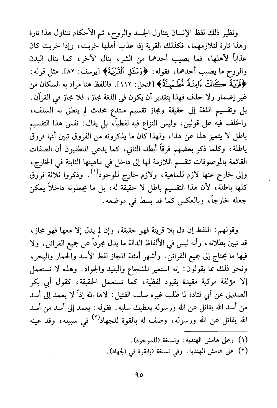 ونظير ذلك لفظ [الإنسان] يتناول الجسد والروح ثم الاحكام تتناول هذا تارة وهذا تارة لتلازمهما؛ فكذلك القرية إذا عذب أهلها خربت وإذا خربت كان عذابا لأهلها فما يصيب أحدهما من الشر ينال الآخر كما ينال البدن والروح ما يصيب أحدهما. فقوله: {وَاسْأَلِ الْقَرْيَةَ} [يوسف: 82] مثل قوله: {قَرْيَةً كَانَتْ آمِنَةً مُّطْمَئِنَّةً} [النحل: 112] . فاللفظ هنا يراد به السكان من غير اضمار ولا حذف فهذا بتقدير أن يكون في اللغة مجاز فلا مجاز في القرآن بل وتقسيم اللغة إلى حقيقة ومجاز تقسيم مبتدع محدث لم ينطق به السلف والخلف فيه على قولين وليس النزاع فيه لفظيا بل يقال نفس هذا التقسيم باطل لا يتميز هذا عن هذا ولهذا كان كل ما يذكرونه من الفروق تبين أنها فروق باطلة وكلما ذكر بعضهم فرقا أبطله الثاني كما يدعى المنطقيون أن الصفات القائمة بالموصوفات تنقسم اللازمة لها إلى داخل في ماهيتها الثابتة في الخارج وإلى خارج عنها لازم للماهية ولازم خارج للوجود وذكروا ثلاثة فروق كلها باطلة لأن هذا التقسيم باطل لا حقيقة له بل ما يجعلونه داخلا يمكن جعله خارجا وبالعكس كما قد بسط في موضعه.