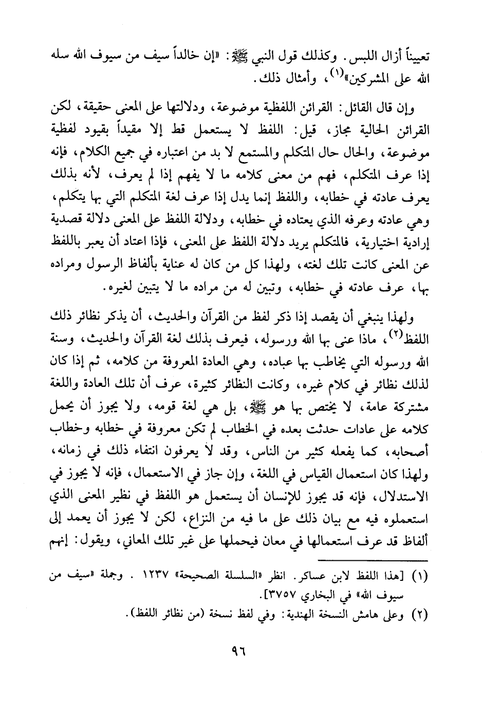 ولهذا ينبغى أن يقصد إذا ذكر لفظ من القرآن والحديث ان يذكر نظائر ذلك اللفظ مإذا عنى بها الله ورسوله فيعرف بذلك لغة القرآن والحديث وسنة الله ورسوله التى يخاطب بها عباده وهى العادة المعروفة من كلامه ثم إذا كان لذلك نظائر في كلام غيره وكانت النظائر كثيرة عرف أن تلك العادة واللغة مشتركة عامة لا يختص بها هو صلى الله عليه وسلم بل هى لغة قومه ولا يجوز أن يحمل كلامه على عادات حدثت بعده في الخطاب لم تكن معروفة في خطابه وخطاب أصحابه كما يفعله كثير من الناس وقد لا يعرفون انتفاء ذلك في زمانه ولهذا كان استعمال القياس في اللغة وان جاز في الاستعمال فانه لا يجوز في الاستدلال فانه قد يجوز بلانسان أن يستعمل هو اللفظ في نظير المعنى الذي استعملوه فيه مع بيان ذلك على ما فيه من النزاع لكن لا يجوز أن يعمد إلى ألفاظ قد عرف استعمالها في معان فيحملها على غير تلك المعانى ويقول انهم