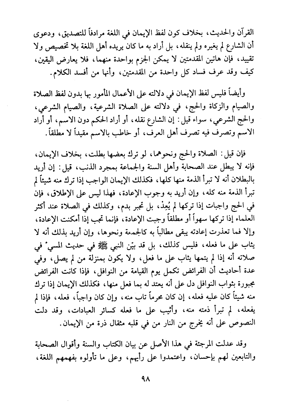 وأيضا فليس لفظ الإيمان في دلالته على الأعمال المأمور بها بدون لفظ الصلاة والصيام والزكاة والحج في دلالته على الصلاة الشرعية والصيام الشرعى والحج الشرعى سواء قيل إن الشارع نقله أو أراد الحكم دون الاسم أو أراد الاسم وتصرف فيه تصرف أهل العرف أو خاطب بالاسم مقيدا لا مطلقا.