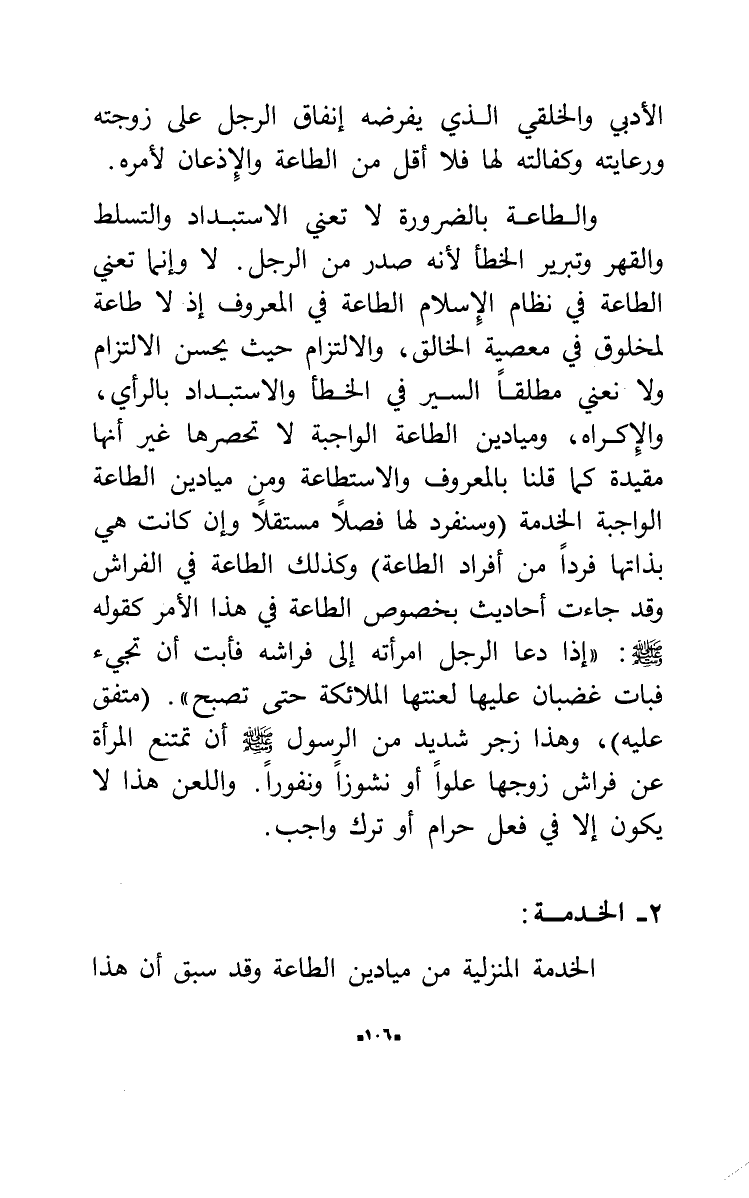 والطاعة بالضرورة لا تعني الاستعباد والتسلط والقهر وتبرير الخطأ لأنه صدر من الرجل. لا وإنما تعني الطاعة في نظام الإسلام الطاعة في المعروف إذ لا طاعة لمخلوق في معصية الخالق، والالتزام حيث يحسن الالتزام ولا نعني مطلقاً السير في الخطأ والاستبداد بالرأي، والإكراه، وميادين الطاعة الواجبة لا تحصرها غير أنها مقيدة كما قلنا بالمعروف والاستطاعة ومن ميادين الطاعة الواجبة الخدمة (وسنفرد لها فصلاً مستقلاً وإن كانت هي بذاتها فرداً من أفراد الطاعة) وكذلك الطاعة في الفراش وقد جاءت أحاديث بخصوص الطاعة في هذا الأمر كقوله صلى الله عليه وسلم: [إذا دعا الرجل امرأته إلى فراشه فأبت أن تجيء فبات غضبان عليها لعنتها الملائكة حتى تصبح] . (متفق عليه) ، وهذا زجر شديد من الرسول صلى الله عليه وسلم أن تمتنع المرأة عن فراش زوجها علواً أو نشوزاً ونفوراً. واللعن هذا لا يكون إلا في فعل حرام أو ترك واجب.