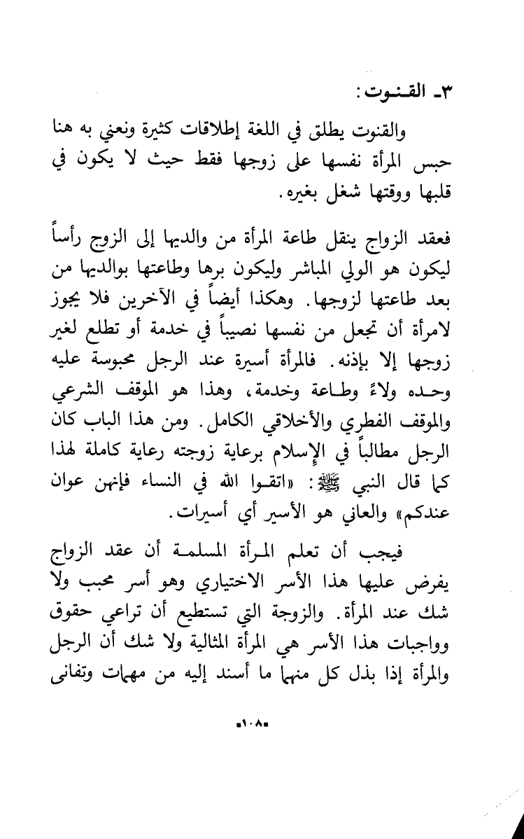فعقد الزواج ينقل طاعة المرأة من والديها إلى الزوج رأساً ليكون هو الولي المباشر وليكون برها وطاعتها بوالديها من بعد طاعتها لزوجها. وهكذا أيضاً في الآخرين فلا يجوز لامرأة أن تجعل من نفسها نصيباً في خدمة أو تطلع لغير زوجها إلا بإذنه. فالمرأة أسيرة عند الرجل محبوسة عليه وحده ولاءً وطاعة وخدمة، وهذا هو الموقف الشرعي والموقف الفطري والأخلاقي الكامل. ومن هذا الباب كان الرجل مطالباً في الإسلام برعاية زوجته رعاية كاملة لهذا كما قال النبي صلى الله عليه وسلم: [اتقوا الله في النساء فإنهن عوان عندكم] والعاني هو الأسير أي أسيرات.