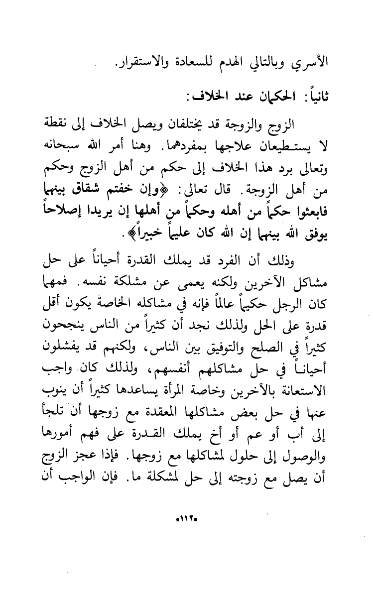 الزوج والزوجة قد يختلفان ويصل الخلاف إلى نقطة لا يستطيعان علاجها بمفردهما. وهنا أمر الله سبحانه وتعالى برد هذا الخلاف إلى حكم من أهل الزوج وحكم من أهل الزوجة. قال تعالى: {وإن خفتم شقاق بينهما فابعثوا حكماً من أهله وحكماً من أهلها إن يريداً إصلاحاً يوفق الله بينهما إن الله كان عليماً خبيراً} .