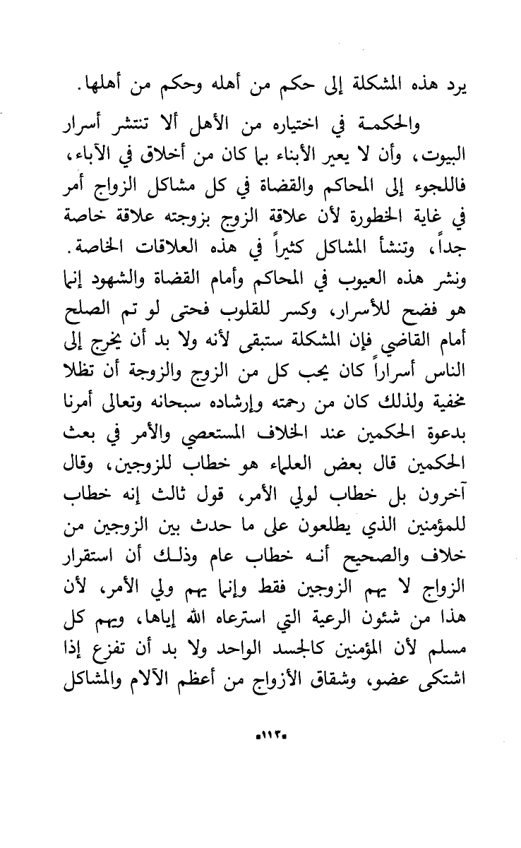 والحكمة في اختياره من الأهل ألا تنتشر أسرار البيوت، وأن لا يعير الأبناء بما كان من أخلاق في الآباء، فاللجوء إلى المحاكم والقضاة في كل مشاكل الزواج أمر في غاية الخطورة لأن علاقة الزوج بزوجته علاقة خاصة جداً، وتنشأ المشاكل كثيراً في هذه العلاقات الخاصة. ونشر هذه العيوب في المحاكم وأمام القضاة والشهود إنما هو فضح للأسرار، وكسر للقلوب فحتى لو تم الصلح أمام القاضي فإن المشكلة ستبقى لأنه ولا بد أن يخرج إلى الناس أسراراً كان يحب كل من الزوج والزوجة أن تظلا مخفية ولذلك كان من رحمته وإرشاده سبحانه وتعالى أمرنا بدعوة الحكمين عند الخلاف المستعصي والأمر في بعث الحكمين قال بعض العلماء هو خطاب للزوجين، وقال آخرون بل خطاب لولي الأمر، قول ثالث إنه خطاب للمؤمنين الذي يطلعون على ما حدث بين الزوجين من خلاف والصحيح أنه خطاب عام وذلك أن استقرار الزواج لا يهم الزوجين فقط وإنما يهم ولي الأمر، لأن هذا من شئون الرعية التي استرعاه الله إياها، ويهم كل مسلم لأن المؤمنين كالجسد الواحد ولا بد أن تفزع إذا اشتكى عضو، وشقاق الأزواج من أعظم الآلام والمشاكل