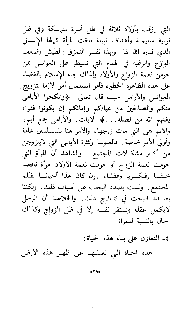 التي رزقت بأولاد ثلاثة في ظل أسرة متماسكة وفي ظل تربية سليمة وأهداف نبيلة بلغت المرأة كمالها الإنساني الذي قدره الله لها. وبهذا نفسر التمزق والطيش وضعف الوازع والرغبة في الهدم التي تسيطر على العوانس ممن حرمن نعمة الزواج والأولاد ولذلك جاء الإسلام بالقضاء على هذه الظاهرة الخطيرة فأمر المسلمين أمراً لازماً بتزويج العوانس والأرامل حيث قال تعالى: {وأنكحوا الأيامى منكم والصالحين من عبادكم وإمائكم إن يكونوا فقراء يغنهم الله من فضله..} الآيات. والأيامى جمع أيم، والأيم هي التي مات زوجها، والأمر هنا للمسلمين عامة وأولي الأمر خاصة. فالعنوسة وكثرة الأيامى التي لا يتزوجن من أكبر مشكلات المجتمع - والشاهد أن المرأة التي حرمت نعمة الزواج أو حرمت نعمة الأولاد امرأة ناقصة خلقياً وفكرياً وعقلياً، وإن كان هذا أحياناً بظلم المجتمع. ولست بصدد البحث عن أسباب ذلك، ولكننا بصدد البحث في نتائج ذلك. والخلاصة أن الرجل لا يكمل عقله وتستقر نفسه إلا في ظل الزواج وكذلك الحال بالنسبة للمرأة.