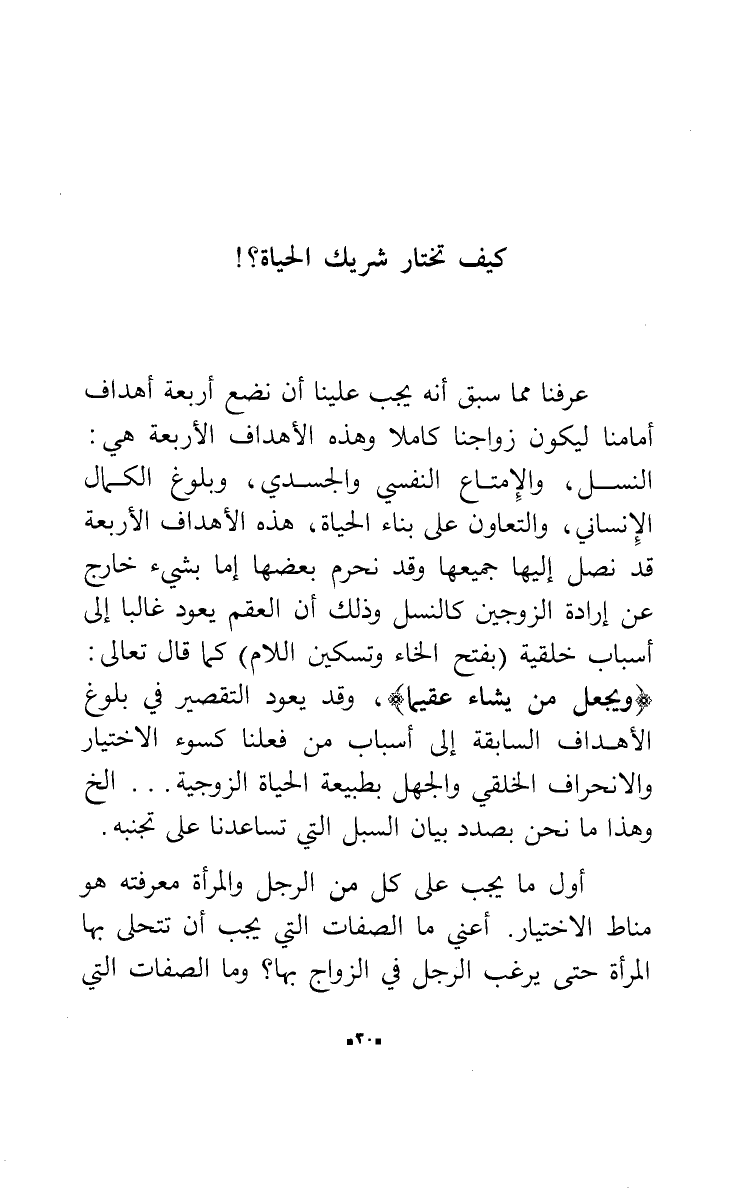عرفنا مما سبق أنه يجب علينا أن نضع أربعة أهداف أمامنا ليكون زواجنا كاملاً وهذه الأهداف الأربعة هي: النسل، والإمتاع النفسي والجسدي، وبلوغ الكمال الإنساني، والتعاون على بناء الحياة، هذه الأهداف الأربعة قد نصل إليها جميعها وقد نحرم بعضها إما بشيء خارج عن إرادة الزوجين كالنسل وذلك أن العقم يعود غالباً إلى أسباب خلقية (بفتح الخاء وتسكين اللام) كما قال تعالى: {ويجعل من يشاء عقيماً} ، وقد يعود التقصير في بلوغ الأهداف السابقة إلى أسباب من فعلنا كسوء الاختيار والانحراف الخلقي والجهل بطبيعة الحياة الزوجية.. الخ وهذا ما نحن بصدد بيان السبل التي تساعدنا على تجنبه.
