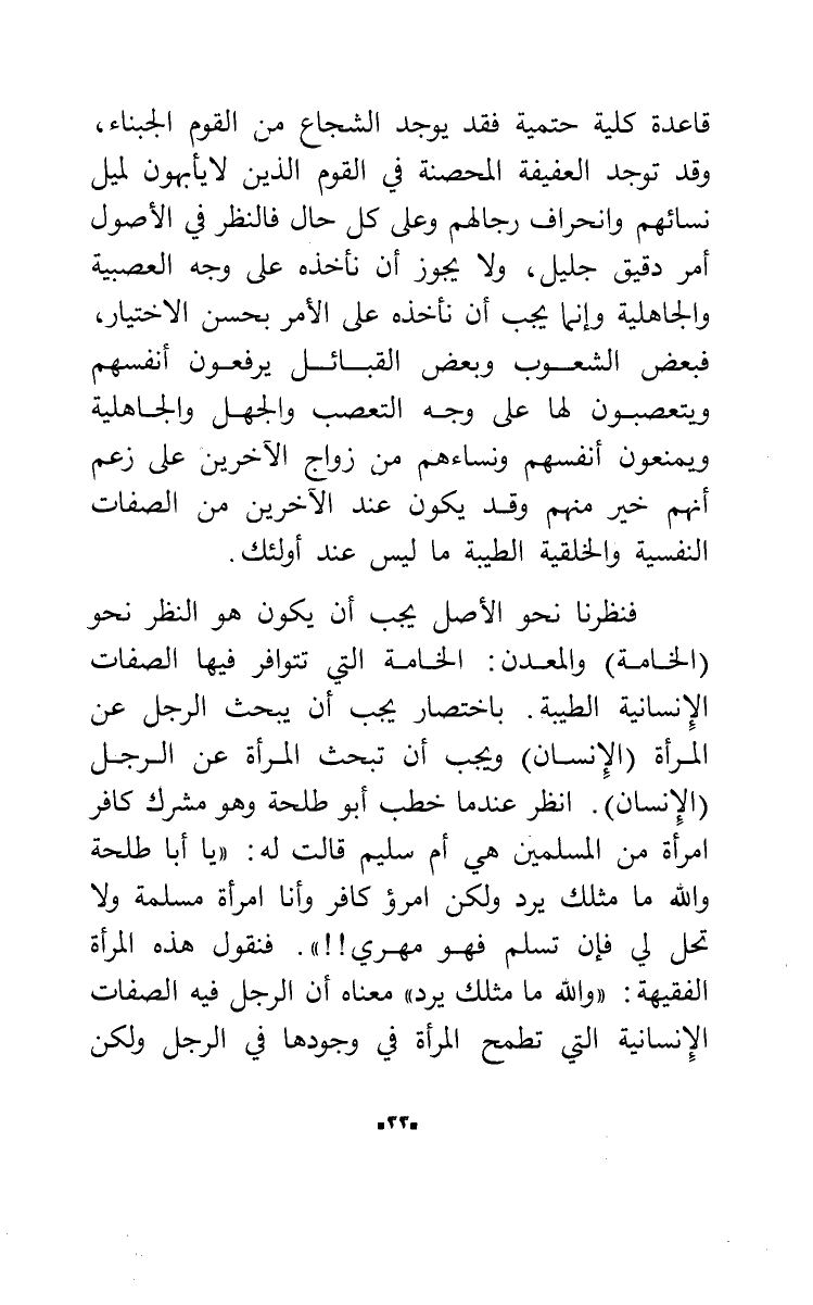 فنظرنا نحو الأصل يجب أن يكون هو النظر نحو (الخامة) والمعدن: الخامة التي تتوافر فيها الصفات الإنسانية الطيبة. باختصار يجب أن يبحث الرجل عن المرأة (الإنسان) ويجب أن تبحث المرأة عن الرجل (الإنسان) . انظر عندما خطب أبو طلحة وهو مشرك كافر امرأة من المسلمين هي أم سليم قالت له: (يا أبا طلحة والله ما مثلك يرد ولكنك امرؤ كافر وأنا امرأة مسلمة ولا تحل لي فإن تسلم فهو مهري!!) . فقول هذه المرأة الفقيهة: (والله ما مثلك يرد) معناه أن الرجل فيه الصفات الإنسانية التي تطمح المرأة في وجودها في الرجل ولكن
