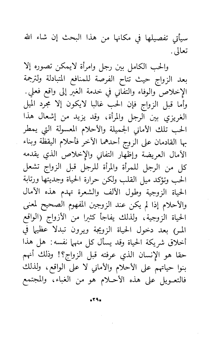 والحب الكامل بين رجل وامرأة لا يمكن تصوره إلا بعد الزواج حيث تتاح الفرصة للمنافع المتبادلة ولترجمة الإخلاص والوفاء والتفاني في خدمة الغير إلى واقع فعلي. وأما قبل الزواج فإن الحب غالباً لا يكون إلا مجرد الميل الغريزي بين الرجل والمرأة، وقد يزيد من إشعال هذا الحب تلك الأماني الجميلة والأحلام المعسولة التي يمطر بها القادمان على الزوج أحدهما الآخر فأحلام اليقظة وبناء الآمال العريضة وإظهار التفاني والإخلاص الذي يقدمه كل من الرجل للمرأة والمرأة للرجل قبل الزواج تشعل الحب وتؤكد ميل القلب ولكن حرارة الحياة وجديتها ورتابة الحياة الزوجية وطول الألف والعشرة تهدم هذه الآمال والأحلام إذا لم يكن عند الزوجين المفهوم الصحيح لمعنى الحياة الزوجية، ولذلك يفاجأ كثيراً من الأزواج (الواقع المر) بعد دخول الحياة الزوجية ويرون تبدلاً عظيماً في أخلاق شريكة الحياة وقد يسأل كل منهما نفسه: هل هذا حقاً هو الإنسان الذي عرفته قبل الزواج؟! وذلك أنهم بنوا حياتهم على الأحلام والأماني لا على الواقع، ولذلك فالتعويل على هذه الأحلام هو من الغباء،
