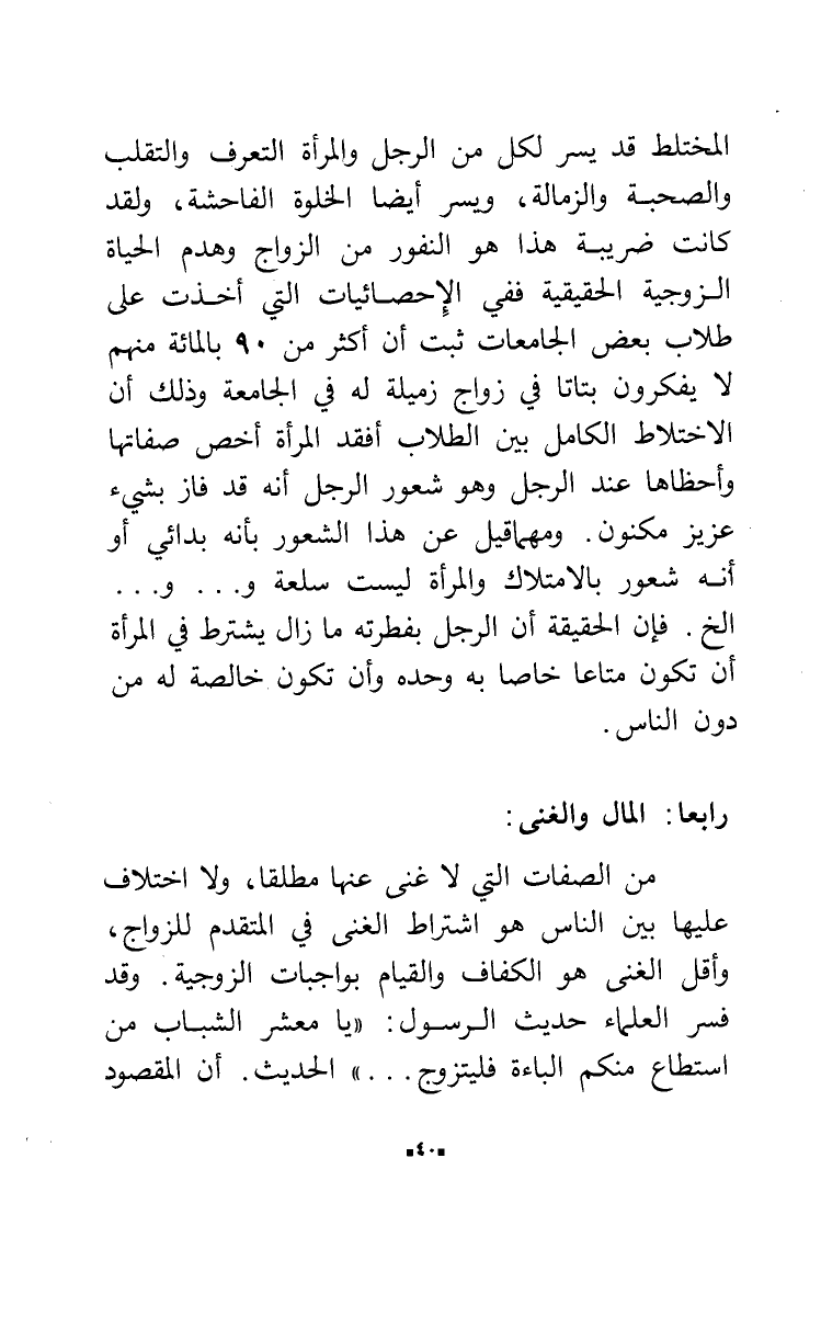 من الصفات التي لا غنى عنها مطلقاً، ولا اختلاف عليها بين الناس هو اشتراط الغنى في المتقدم للزواج، وأقل الغنى هو الكفاف والقيام بواجبات الزوجية. وقد فسر العلماء حديث الرسول: [يا معشر الشباب من استطاع منكم الباءة فليتزوج..] الحديث. أن المقصود