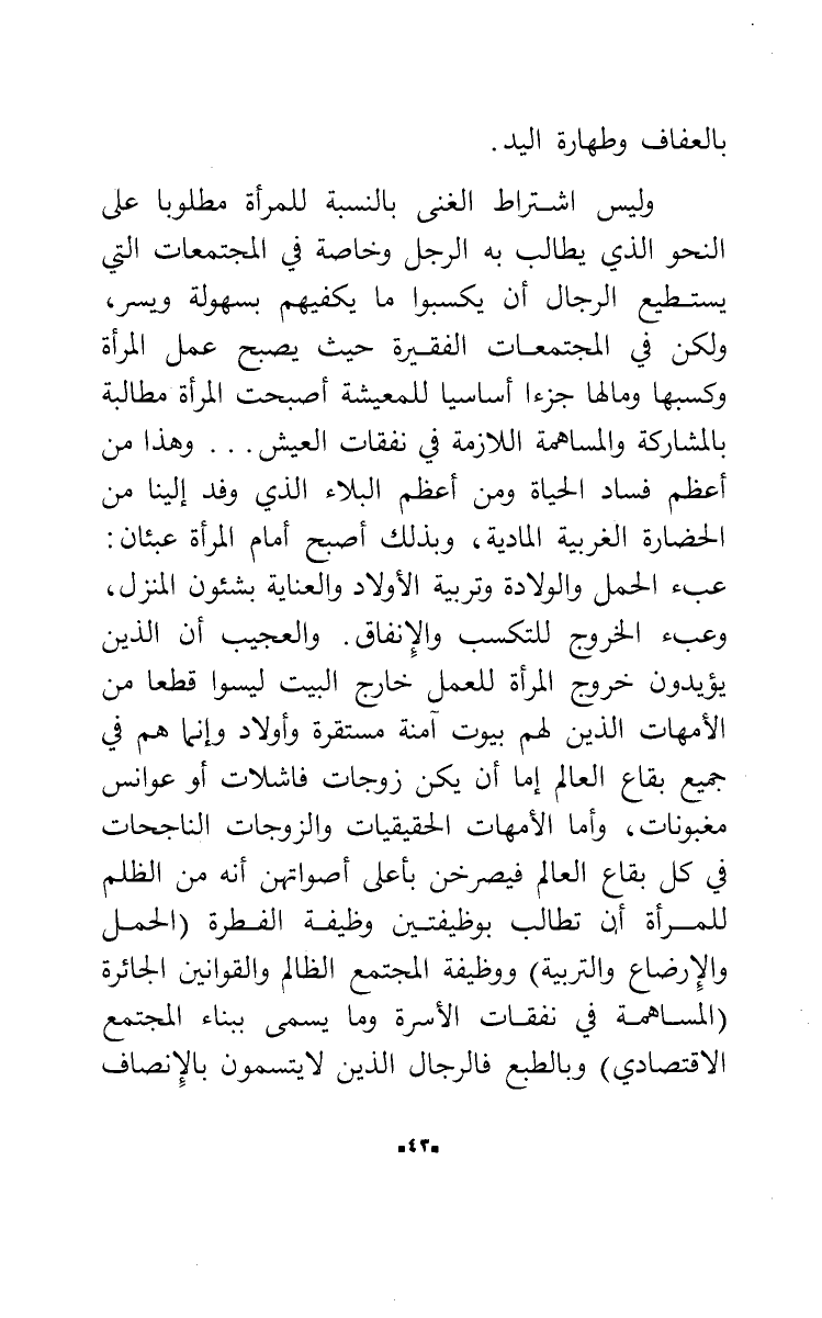 وليس اشتراط الغنى بالنسبة للمرأة مطلوباً على النحو الذي يطالب به الرجل وخاصة في المجتمعات التي يستطيع الرجال أن يكسبوا ما يكفيهم بسهولة ويسر، ولكن في المجتمعات الفقيرة، حيث يصبح عمل المرأة وكسبها ومالها جزءاً أساسياً للمعيشة أصبحت المرأة مطالبة بالمشاركة والمساهمة اللازمة في نفقات العيش.. وهذا من أعظم فساد الحياة ومن أعظم البلاء الذي وفد إلينا من الحضارة الغربية المادية، وبذلك أصبح أمام المرأة عبئان: عبء الحمل والولادة وتربية الأولاد والعناية بشئون المنزل، وعبء الخروج للتكسب والإنفاق. والعجيب أن الذين يؤيدون خروج المرأة للعمل خارج البيت ليسوا قطعاً من الأمهات الذين لهم بيوت آمنة مستقرة وأولاد وإنما هم في جميع بقاع العالم إما أن يكن زوجات فاشلات أو عوانس مغبونات، وأما الأمهات الحقيقيات والزوجات الناجحات في كل بقاع العالم فيصرخن بأعلى أصواتهن أنه من الظلم للمرأة أن تطالب بوظيفتين وظيفة الفطرة (الحمل والإرضاع والتربية) ووظيفة المجتمع الظالم والقوانين الجائرة (المساهمة في نفقات الأسرة وما يسمى ببناء المجتمع الاقتصادي) وبالطبع فالرجال الذين لا يتسمون بالإنصاف