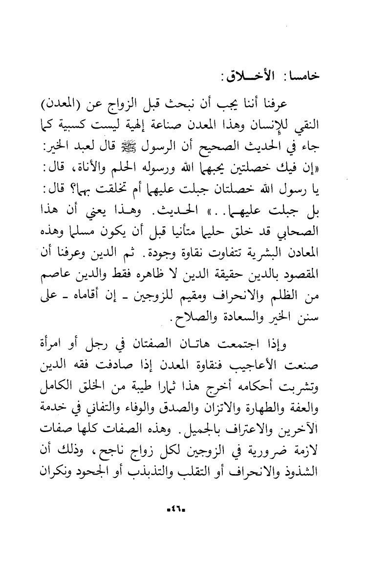 وإذا اجتمعت هاتان الصفتان في رجل أو امرأة صنعت الأعاجيب فنقاوة المعدن إذا صادفت فقه الدين وتشربت أحكامه أخرج هذا ثماراً طيبة من الخلق الكامل والعفة والطهارة والاتزان والصدق والوفاء والتفاني في خدمة الآخرين والاعتراف بالجميل. وهذه الصفات كلها صفات لازمة ضرورية في الزوجين لكل زواج ناجح، وذلك أن الشذوذ والانحراف أو التقلب والتذبذب أو الجحود ونكران