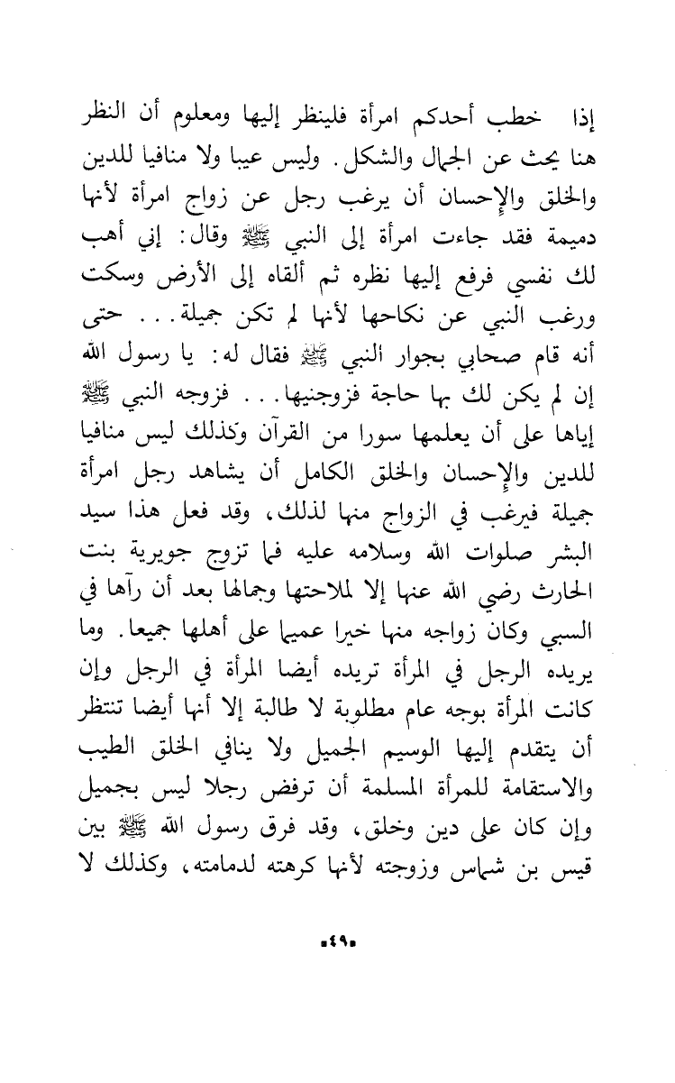 إذا خطب أحدكم امرأة فلينظر إليها ومعلوم أن النظر هنا بحث عن الجمال والشكل. وليس عيباً ولا منافيا للدين والخلق والإحسان أن يرغب رجل عن زواج امرأة لأنها دميمة فقد جاءت امرأة إلى النبي صلى الله عليه وسلم وقالت: إني أهب لك نفسي فرفع إليها نظره ثم ألقاه إلى الأرض وسكت ورغب النبي عن نكاحها لأنها لم تكن جميلة.. حتى أنه قام صحابي بجوار النبي صلى الله عليه وسلم فقال له: يا رسول الله إن لم يكن لك بها حاجة فزوجنيها.. فزوجه النبي صلى الله عليه وسلم إياها على أن يعلمها سوراً من القرآن وكذلك ليس منافياً للدين والإحسان والخلق الكامل أن يشاهد رجل امرأة جميلة فيرغب في الزواج منها لذلك، وقد فعل هذا سيد البشر صلوات الله وسلامه عليه فما تزوج جويرية بنت الحارث رضي الله عنها إلا لملاحتها وجمالها بعد أن رآها في السبي وكان زواجه منها خيراً عميماً على أهلها جميعاً. وما يريده الرجل في المرآة تريده أيضاً المرأة في الرجل وإن كانت المرأة بوجه عام مطلوبة لا طالبة إلا أنها أيضاً تنتظر أن يتقدم إليها الوسيم الجميل ولا ينافي الخلق الطيب والاستقامة للمرأة المسلمة أن ترفض رجلاً ليس بجميل وإن كان على دين وخلق، وقد فرق رسول الله صلى الله عليه وسلم بين قيس بن شماس وزوجته لأنها كرهته لدمامته، وكذلك لا