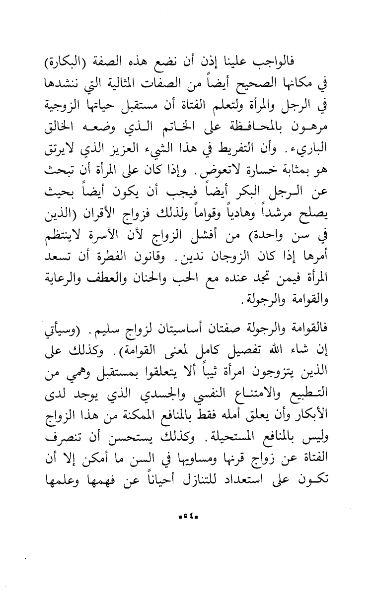 فالواجب علينا إذن أن نضع هذه الصفة (البكارة) في مكانها الصحيح أيضاً من الصفات المثالية التي ننشدها في الرجل والمرأة ولتعلم الفتاة أن مستقبل حياتها الزوجية مرهون بالمحافظة على الخاتم الذي وضعه الخالق البارئ. وأن التفريط في هذا الشيء العزيز الذي لا يرتق هو بمثابة خسارة لا تعوض. وإذا كان على المرأة أن تبحث عن الرجل البكر أيضاً فيجب أن يكون أيضاً بحيث يصلح مرشداً وهادياً وقواماً ولذلك فزواج الأقران (الذين في سن واحدة) من أفشل الزواج لأن الأسرة لا ينتظم أمرها إذا كان الزوجان ندين. وقانون الفطرة أن تسعد المرأة فيمن تجد عنده مع الحب والحنان والعطف والرعاية والقوامة والرجولة.
