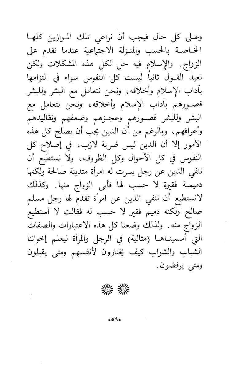 وعلى كل حال فيجب أن نراعي تلك الموازين كلها الخاصة بالحسب والمنزلة الاجتماعية عندما نقدم على الزواج. والإسلام فيه حل لكل هذه المشكلات ولكن نعيد القول ثانياً ليست كل النفوس سواء في التزامها بآداب الإسلام وأخلاقه، ونحن نتعامل مع البشر وللبشر قصورهم بآداب الإسلام وأخلاقه، ونحن نتعامل مع البشر وللبشر قصورهم وعجزهم وضعفهم وتقاليدهم وأعرافهم، وبالرغم من أن الدين يجب أن يصلح كل هذه الأمور إلا أن الدين ليس ضربة لازب، في إصلاح كل النفوس في كل الأحوال وكل الظروف، ولا نستطيع أن ننفي الدين عن رجل يسرت له امرأة متدينة صالحة ولكنها دميمة فقيرة لا حسب لها فأبى الزواج منها. وكذلك لا نستطيع أن ننفي الدين عن امرأة تقدم لها رجل مسلم صالح ولكنه دميم فقير لا حسب له فقالت لا أستطيع الزواج منه. ولذلك وضعنا كل هذه الاعتبارات والصفات التي أسميناها (مثالية) في الرجل والمرأة ليعلم إخواننا الشباب والشواب كيف يختارون لأنفسهم ومتى يقبلون ومتى يرفضون.