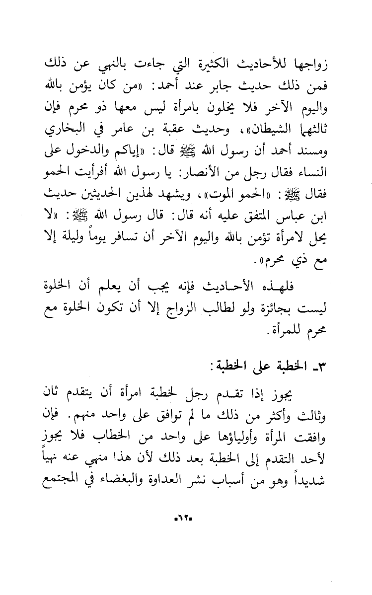 زواجها للأحاديث الكثيرة التي جاءت بالنهي عن ذلك فمن ذلك حديث جابر عند أحمد: [من كان يؤمن بالله واليوم الآخر فلا يخلون بامرأة ليس معها ذو محرم فإن ثالثهما الشيطان] ، وحديث عقبة بن عامر في البخاري ومسند أحمد أن رسول الله صلى الله عليه وسلم قال: [إياكم والدخول على النساء] فقال رجل من الأنصار: يا رسول الله أفرأيت الحمو فقال صلى الله عليه وسلم: [الحمو الموت] ، ويشهد لهذين الحديثين حديث ابن عباس المتفق عليه أنه قال: قال رسول الله صلى الله عليه وسلم: [لا يحل لامرأة تؤمن بالله واليوم الآخر أن تسافر يوماً وليلة إلا مع ذي محرم] .