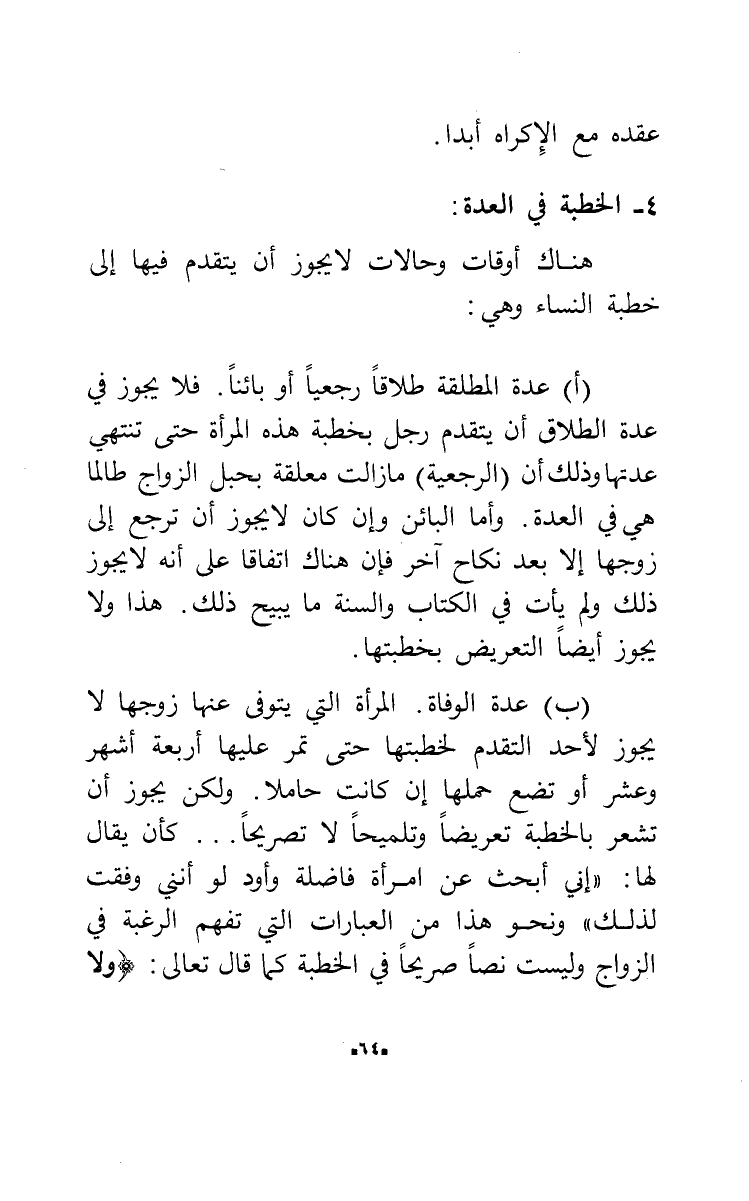 (أ) عدة المطلقة طلاقاً رجعياً أو بائناً. فلا يجوز في عدة الطلاق أن يتقدم رجل بخطبة هذه المرأة حتى تنتهي عدتها وذلك أن (الرجعية) ما زالت معلقة بحبل الزواج طالما هي في العدة. وأما البائن وإن كان لا يجوز أن ترجع إلى زوجها إلا بعد نكاح آخر فإن هناك اتفاقاً على أنه لا يجوز ذلك ولم يأت في الكتاب والسنة ما يبيح ذلك. هذا ولا يجوز أيضاً التعريض بخطبتها.