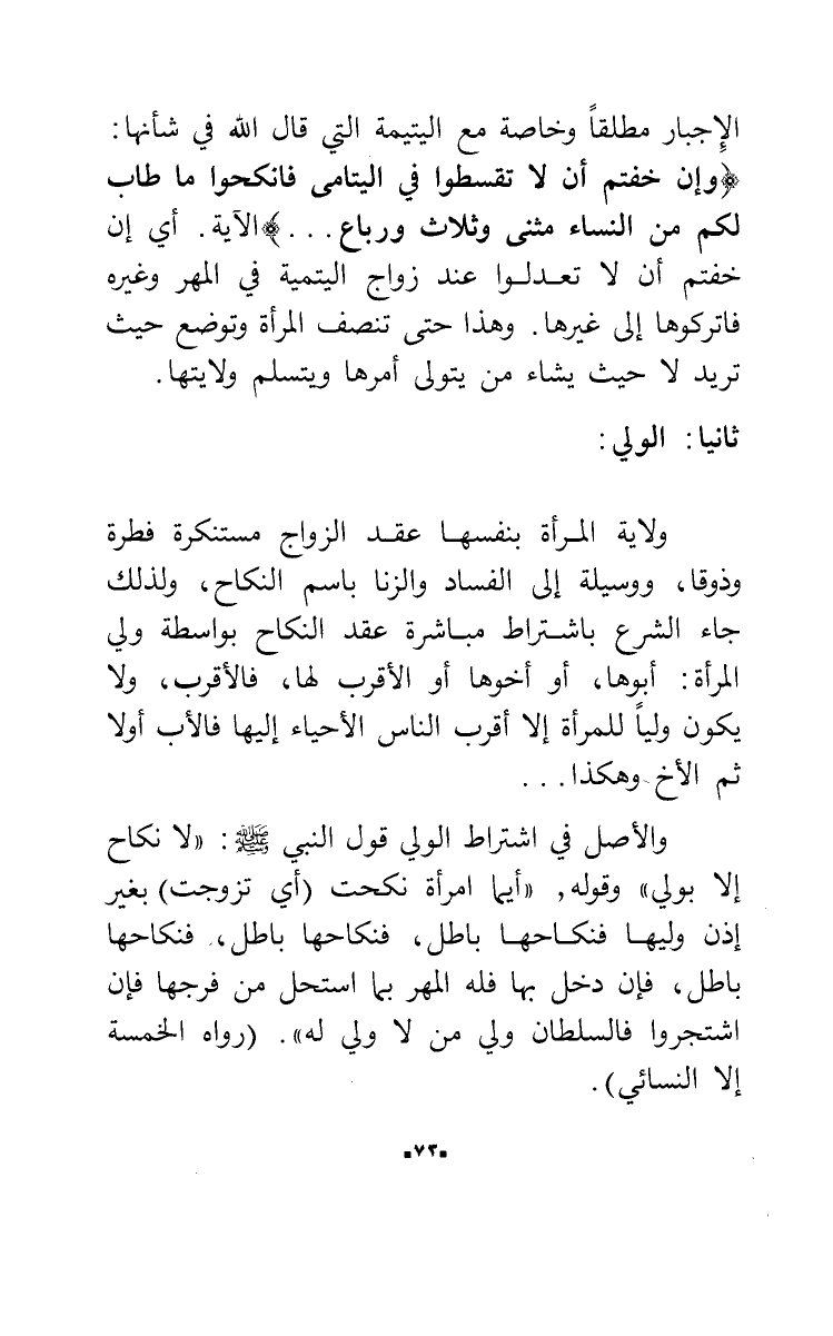 الإجبار مطلقاً وخاصة مع اليتيمة التي قال الله في شأنها: {وإن خفتم أن لا تقسطوا في اليتامى فانكحوا ما طاب لكم من النساء مثنى وثلاث ورباع..} الآية. أي إن خفتم أن لا تعدلوا عند زواج اليتيمة في المهر وغيره فاتركوها إلى غيرها. وهذا حتى تنصف المرأة وتوضع حيث تريد لا حيث يشاء من يتولى أمرها ويتسلم ولايتها.