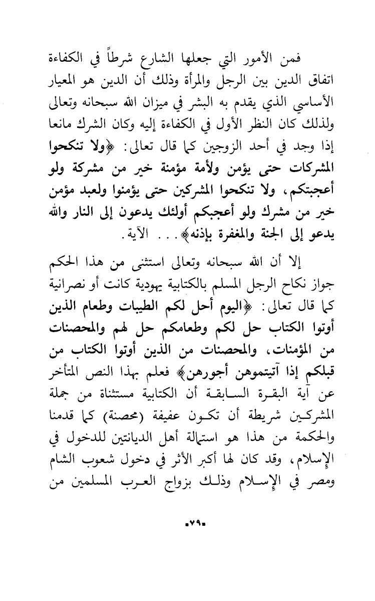 فمن الأمور التي جعلها الشارع شرطاً في الكفاءة اتفاق الدين بين الرجل والمرأة وذلك أن الدين هو المعيار الأساسي الذي يقدم به البشر في ميزان الله سبحانه وتعالى ولذلك كان النظر الأول في الكفاءة إليه وكان الشرك مانعاً إذا وجد في أحد الزوجين كما قال تعالى: {ولا تنكحوا المشركات حتى يؤمن ولأمة مؤمنة خير من مشركة ولو أعجبتكم، ولا تنكحوا المشركين حتى يؤمنوا ولعبد مؤمن خير من مشرك ولو أعجبكم أولئك يدعون إلى النار والله يدعو إلى الجنة والمغفرة بإذنه} .. الآية.