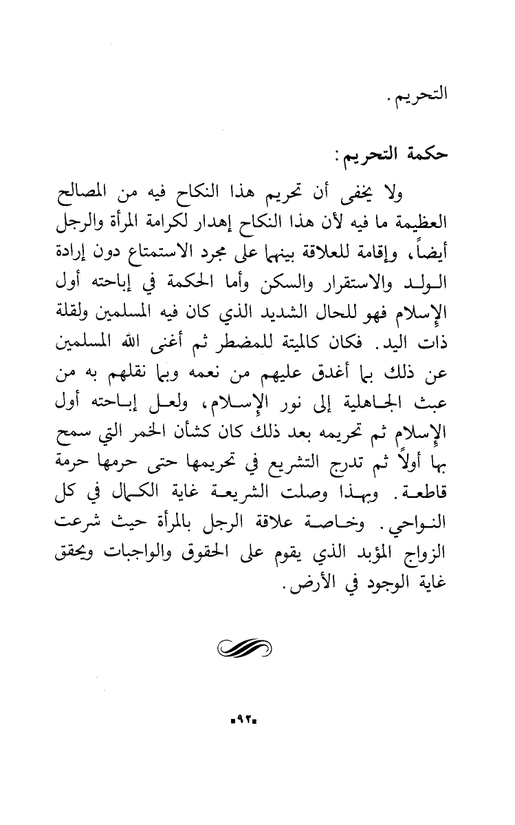 ولا يخفى أن تحريم هذا النكاح فيه من المصالح العظيمة ما فيه لأن هذا النكاح إهدار لكرامة المرأة والرجل أيضاً، وإقامة للعلاقة بينهما على مجرد الاستمتاع دون إرادة الولد والاستقرار والسكن وأما الحكمة في إباحته أول الإسلام فهو للحال الشديد الذي كان فيه المسلمين ولقلة ذات اليد. فكان كالميتة للمضطر ثم أغنى الله المسلمين عن ذلك بما أغدق عليهم من نعمه وبما نقلهم به من عبث الجاهلية إلى نور الإسلام، ولعل إباحته أول الإسلام ثم تحريمه بعد ذلك كان كشأن الخمر التي سمح بها أولاً ثم تدرج التشريع في تحريمها حتى حرمها حرمة قاطعة. وبهذا وصلت الشريعة غاية الكمال في كل النواحي. وخاصة علاقة الرجل بالمرأة حيث شرعت الزواج المؤبد الذي يقوم على الحقوق والواجبات ويحقق غاية الوجود في الأرض.