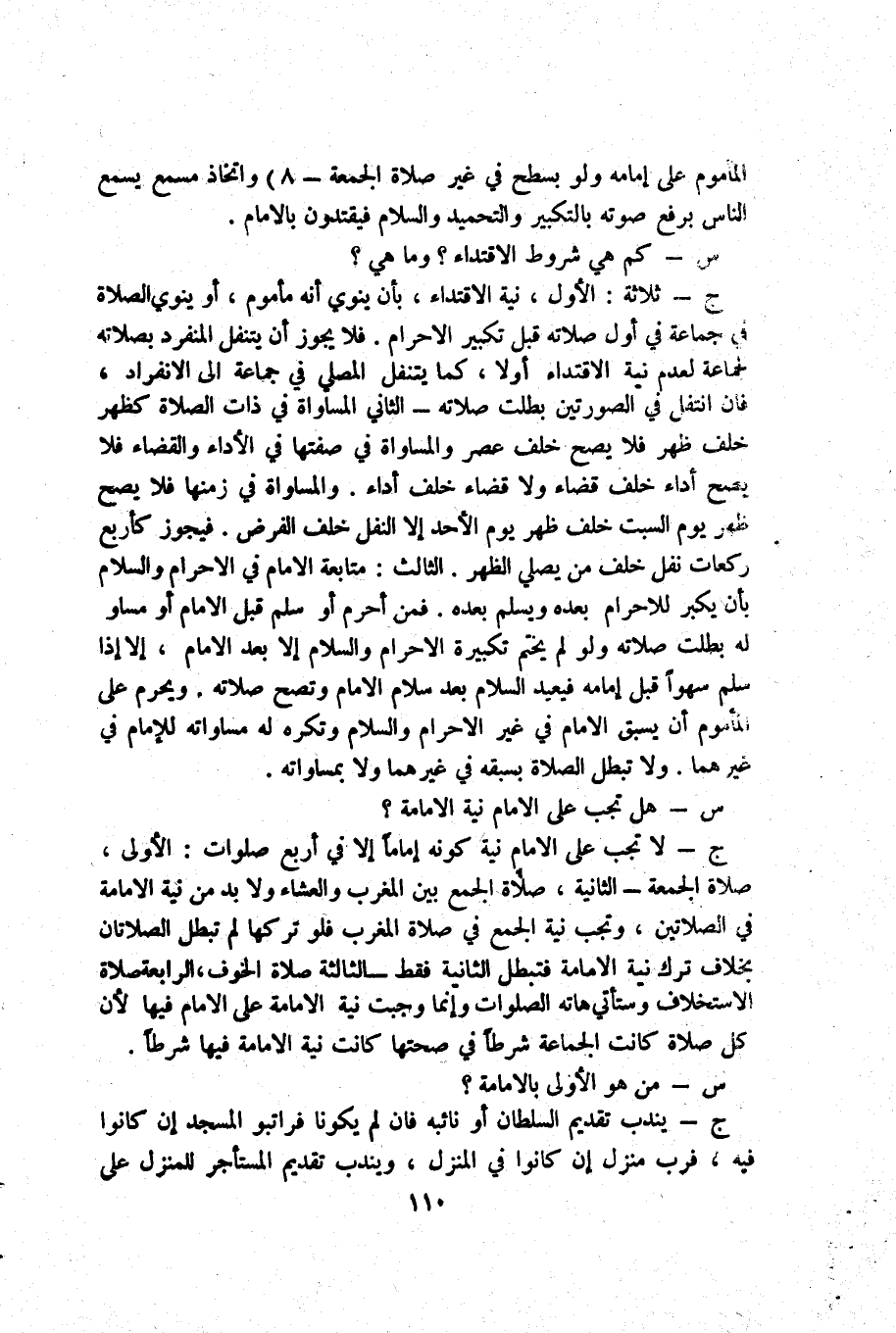 ج _ لَا تجب على الإِمَام نِيَّة كَونه إِمَامًا إِلَّا فِي أَربع صلوَات الأولى صَلَاة الْجُمُعَة الثَّانِيَة صَلَاة الْجمع بَين الْمغرب وَالْعشَاء وَلَا بُد من نِيَّة الْإِمَامَة فِي الصَّلَاتَيْنِ وَتجب نِيَّة الْجمع فِي صَلَاة الْمغرب فَلَو تَركهَا لم تبطل الصَّلَاتَان بِخِلَاف ترك نِيَّة الْإِمَامَة فَتبْطل الثَّانِيَة فَقَط الثَّالِثَة صَلَاة الْخَوْف الرَّابِعَة صَلَاة الإستخلاف وَسَتَأْتِي هاته الصَّلَوَات وَإِنَّمَا وَجَبت نِيَّة الْإِمَامَة على الإِمَام فِيهَا لِأَن كل صَلَاة كَانَت الْجَمَاعَة شرطا فِي صِحَّتهَا كَانَت نِيَّة الْإِمَامَة فِيهَا شرطا