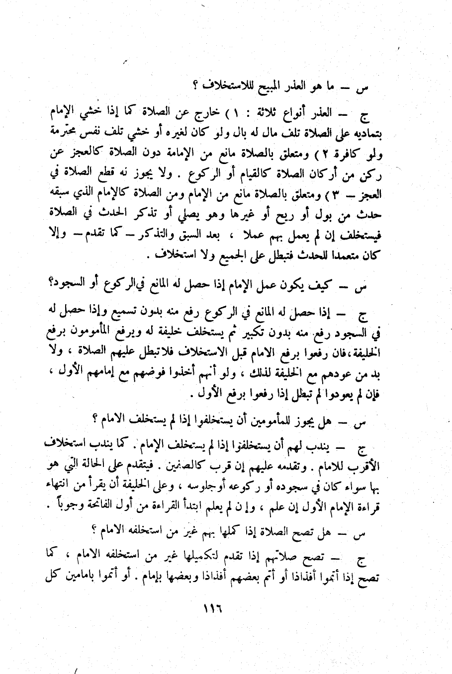 ج _ إِذا حصل لَهُ الْمَانِع فِي الرُّكُوع رفع مِنْهُ بِدُونِ تسميع وَإِذا حصل لَهُ فِي السُّجُود رفع مِنْهُ بِدُونِ تَكْبِير ثمَّ يسْتَخْلف خَليفَة لَهُ وَيرْفَع المأمومون بِرَفْع الْخَلِيفَة فَإِن رفعوا بِرَفْع الإِمَام قبل الإستخلاف فَلَا تبطل عَلَيْهِم الصَّلَاة وَلَا بُد من عودهم مَعَ الْخَلِيفَة لذَلِك وَلَو أَنهم أخذُوا فوضهم مَعَ إمَامهمْ الأول فَإِن لم يعودوا لم تبطل إِذا رفعوا بِرَفْع الأول