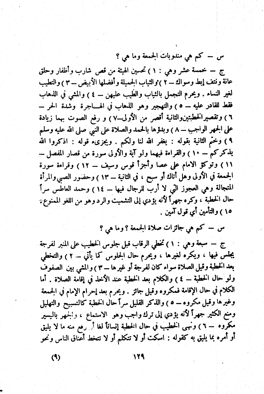 ج _ خَمْسَة عشر وَهِي 1) تَحْسِين الْهَيْئَة من قصّ شَارِب وأظفار وَحلق عانة ونتف إبط وَسوَاك 2) وَالثيَاب الجميلة وأفضلها الْأَبْيَض 3) والتطيب لغير النِّسَاء