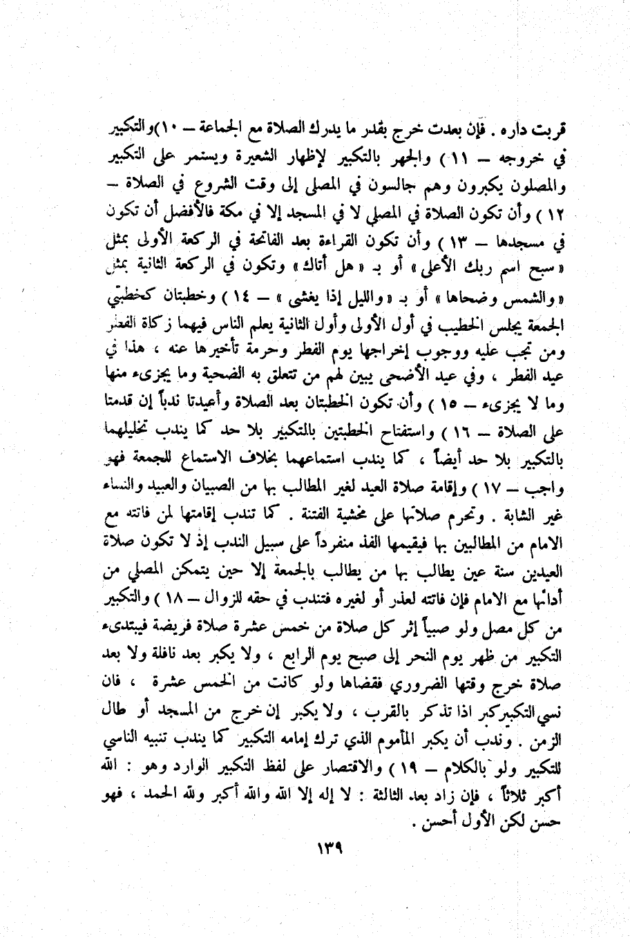 كَمَا تندب إِقَامَتهَا لمن فَاتَتْهُ مَعَ الإِمَام من المطالبين بهَا فيقيمها الْفَذ مُنْفَردا على سَبِيل النّدب إِذْ لَا تكون صَلَاة الْعِيدَيْنِ سنة عين يُطَالب بهَا من يُطَالب بِالْجمعَةِ إِلَّا حِين يتَمَكَّن الْمُصَلِّي من أَدَائِهَا مَعَ الإِمَام فَإِن فَاتَتْهُ لعذر أَو لغيره فتندب فِي حَقه للزوال 18) وَالتَّكْبِير من كل مصل وَلَو صَبيا إِثْر كل صَلَاة من خمس عشرَة صَلَاة فَرِيضَة فيبتدئ التَّكْبِير من ظهر يَوْم النَّحْر إِلَى صبح يَوْم الرَّابِع وَلَا يكبر بعد نَافِلَة وَلَا بعد صَلَاة خرج وَقتهَا الضَّرُورِيّ فقضاها وَلَو كَانَت من الْخمس عشرَة فَإِن نسي التَّكْبِير كبر إِذا تذكر بِالْقربِ وَلَا يكبر إِن خرج من الْمَسْجِد أَو طَال الزَّمن