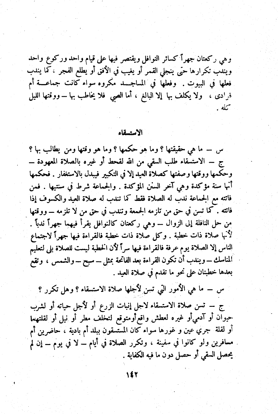 ج _ الإستسقاء طلب السَّقْي من الله لقحط أَو غَيره بِالصَّلَاةِ الْمَعْهُودَة وَحكمهَا ووقتها وصفتها كَصَلَاة الْعِيد إِلَّا فِي التَّكْبِير فيبدل بالإستغفار