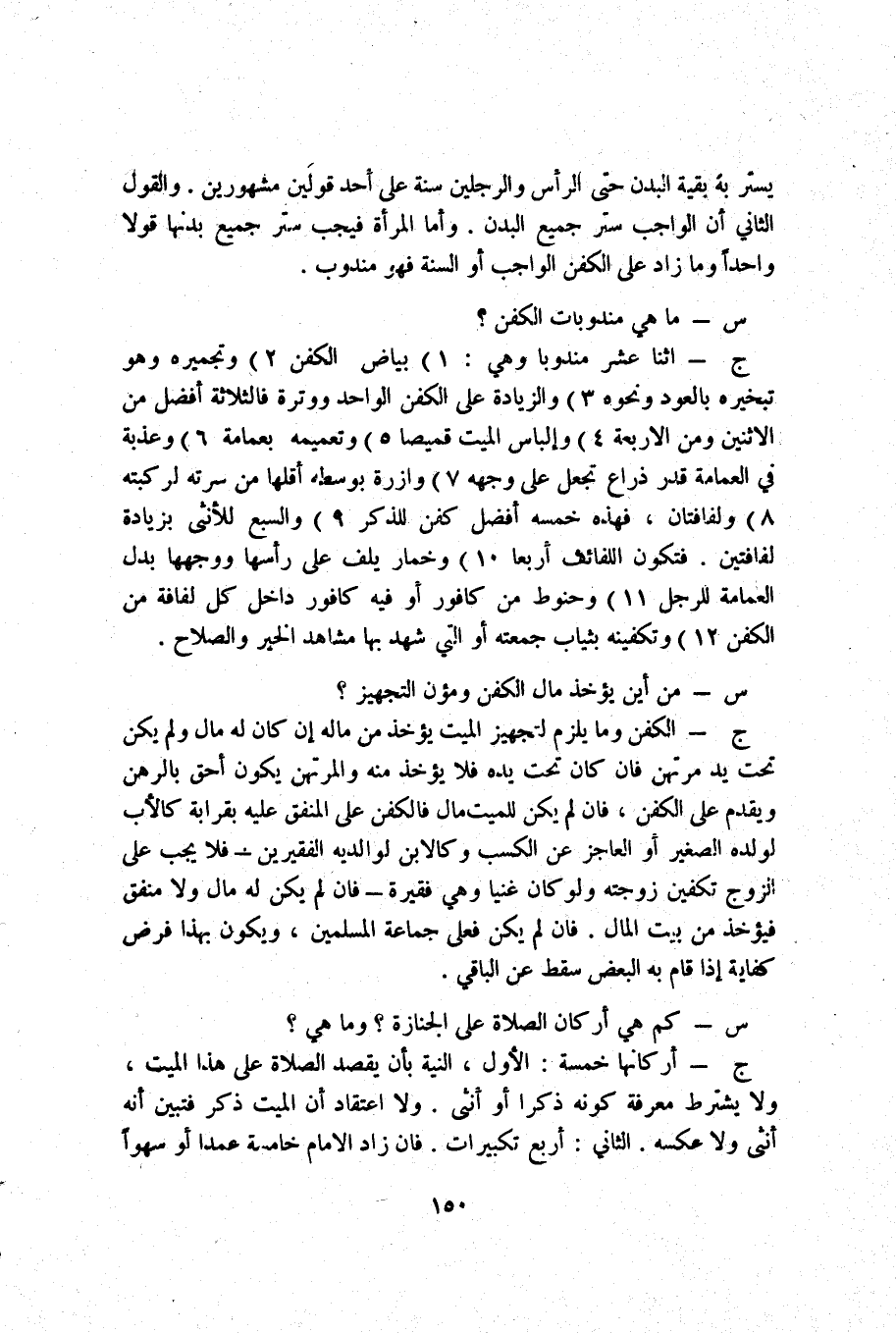 فَتكون اللفائف أَرْبعا 10) وخمار يلف على رَأسهَا ووجهها بدل الْعِمَامَة للرجل 11) وحنوط من كافور أَو فِيهِ كافور دَاخل كل لفافة من الْكَفَن 12) وتكفينه بِثِيَاب جمعته أَو الَّتِي شهد بهَا مشَاهد الْخَيْر وَالصَّلَاح