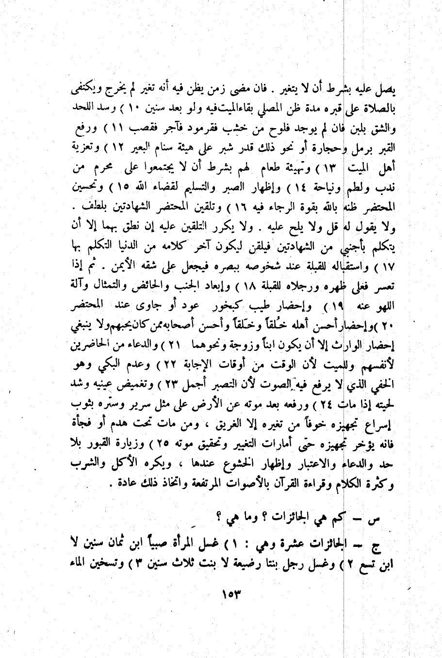 ثمَّ إِذا تعسر فعلى ظَهره وَرجلَاهُ للْقبْلَة 18) وإبعاد الْجنب وَالْحَائِض والتمثال وَآلَة اللَّهْو عَنهُ 19) وإحضار طيب كبخور عود أَو جاوى عِنْد المحتضر 20) وإحضار أحسن أَهله خلقا وخلقا وَأحسن أَصْحَابه مِمَّن كَانَ يُحِبهُمْ وَلَا يَنْبَغِي إِحْضَار الْوَارِث إِلَّا أَن يكون ابْنا وَزَوْجَة وَنَحْوهمَا 21) وَالدُّعَاء من الْحَاضِرين لأَنْفُسِهِمْ وللميت لِأَن الْوَقْت من أَوْقَات الْإِجَابَة 22) وَعدم البكي وَهُوَ الْخَفي الَّذِي لَا يرفع فِيهِ الصَّوْت لِأَن التصبر أجمل 23) وتغميض عَيْنَيْهِ وَشد لحيته إِذا مَاتَ 24) وَرَفعه بعد مَوته عَن الأَرْض على مثل سَرِير وستره بِثَوْب إسراع تَجْهِيزه خوفًا من تغيره إِلَّا الغريق وَمن مَاتَ تَحت هدم أَو فَجْأَة فَإِنَّهُ يُؤَخر تَجْهِيزه حَتَّى أَمَارَات التَّغْيِير وَتَحْقِيق مَوته 25) وَزِيَادَة الْقُبُور بِلَا حد وَالدُّعَاء والإعتبار وَإِظْهَار الْخُشُوع عِنْدهَا وَيكرهُ الْأكل وَالشرب وَكَثْرَة الْكَلَام وَقِرَاءَة الْقُرْآن بالأصوات المرتفعة واتخاذ ذَلِك عَادَة