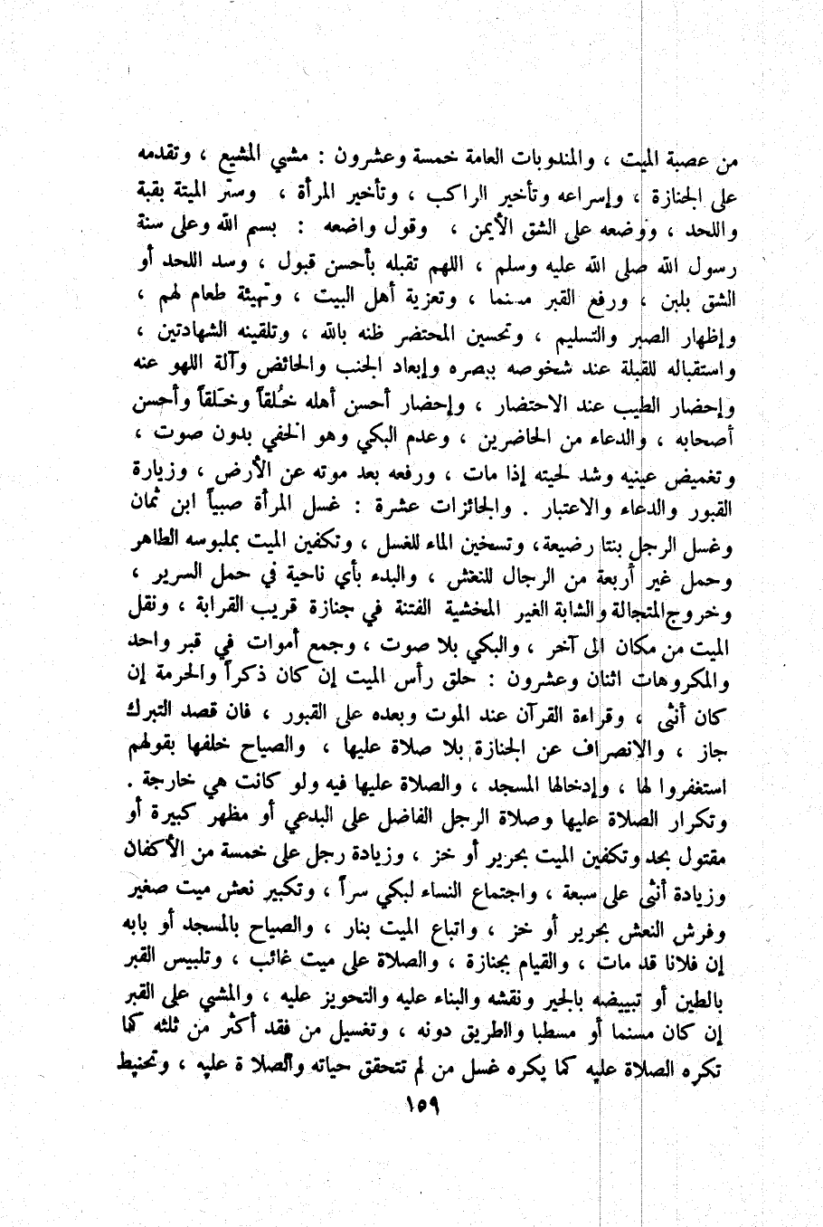 من عصبَة الْمَيِّت والمندوبات الْعَامَّة خَمْسَة وَعِشْرُونَ مشي المشيع وتقدمه على الْجِنَازَة وإسراعه وَتَأْخِير الرَّاكِب وَتَأْخِير الْمَرْأَة وَستر الْميتَة بقبة واللحد وَوَضعه على الشق الْأَيْمن وَقَول وَاضعه بِسم الله وعَلى سنة رَسُول الله صلى الله عَلَيْهِ وَسلم اللَّهُمَّ تقبله بِأَحْسَن قبُول وسد اللَّحْد أَو الشق بِلَبن وَرفع الْقَبْر مسنما وتعزية أهل الْبَيْت وتهيئة طَعَام لَهُم وَإِظْهَار الصَّبْر وَالتَّسْلِيم وتحسين المحتضر ظَنّه بِاللَّه وتلقينه الشَّهَادَتَيْنِ واستقباله للْقبْلَة عِنْد شخوصه ببصره وإبعاد الْجنب وَالْحَائِض وَآلَة اللَّهْو عَنهُ وإحضار الطّيب عِنْد الإحتضار وإحضار أحسن أَهله خلقا وخلقا وَأحسن أَصْحَابه وَالدُّعَاء من الْحَاضِرين وَعدم البكي وَهُوَ الْخَفي بِدُونِ صَوت وتغميض عَيْنَيْهِ وَشد لحيته إِذا مَاتَ وَرَفعه بعد مَوته عَن الأَرْض وزيارة الْقُبُور وَالدُّعَاء والإعتبار