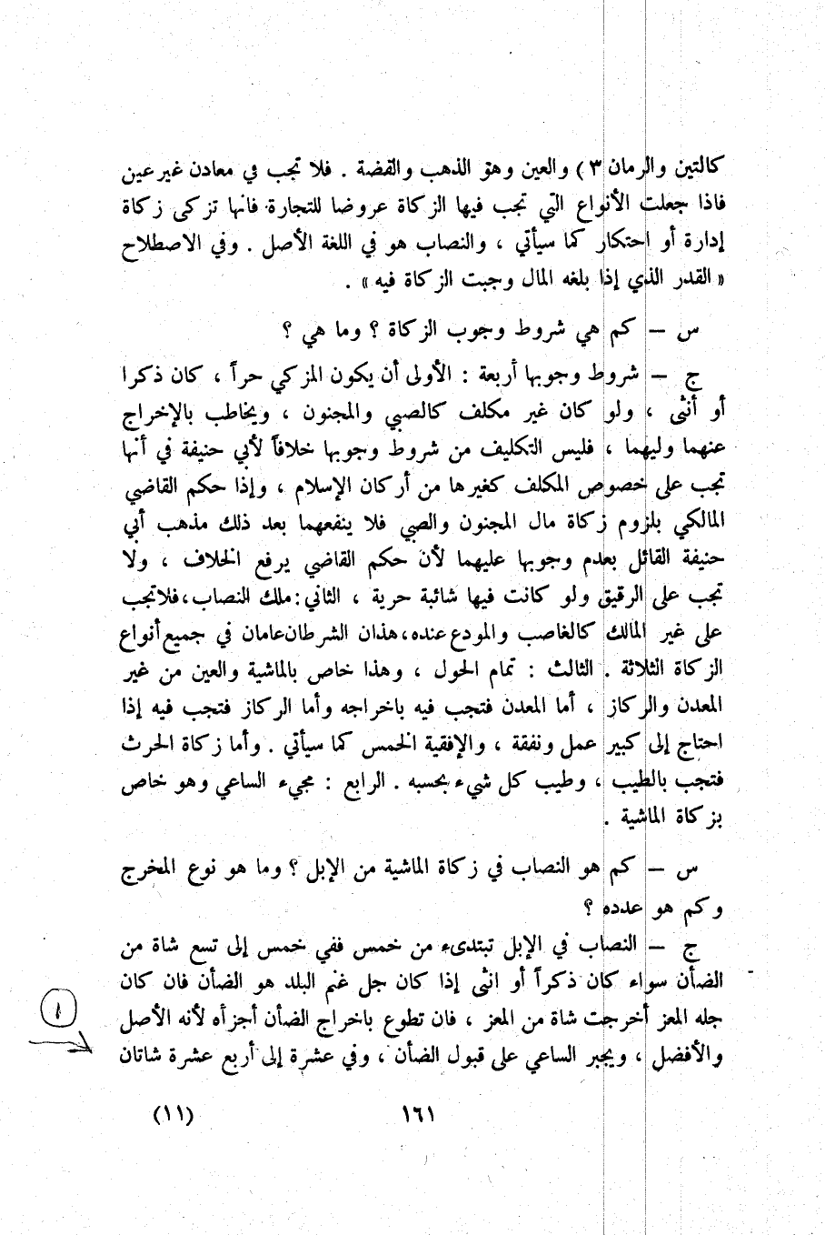 ج _ شُرُوط وُجُوبهَا أَرْبَعَة الأولى أَن يكون الْمُزَكي حرا كَانَ ذكرا أَو أُنْثَى وَلَو كَانَ غير مُكَلّف كَالصَّبِيِّ وَالْمَجْنُون ويخاطب بِالْإِخْرَاجِ عَنْهُمَا وليهما فَلَيْسَ التَّكْلِيف من شُرُوط وُجُوبهَا خلافًا لأبي حنيفَة فِي أَنَّهَا تجب على خُصُوص الْمُكَلف كَغَيْرِهَا من أَرْكَان الْإِسْلَام وَإِذا حكم القَاضِي الْمَالِكِي بِلُزُوم زَكَاة مَال الْمَجْنُون وَالصَّبِيّ فَلَا ينفعهما بعد ذَلِك مَذْهَب أبي حنيفَة الْقَائِل بِعَدَمِ وُجُوبهَا عَلَيْهِمَا لِأَن حكم القَاضِي يرفع الْخلاف وَلَا تجب على الرَّقِيق وَلَو كَانَت فِيهَا شَائِبَة حريَّة الثَّانِي ملك النّصاب فَلَا تجب على غير الْمَالِك كَالْغَاصِبِ وَالْمُودع عِنْده هَذَانِ الشرطان عامان فِي جَمِيع أَنْوَاع الزَّكَاة الثَّلَاثَة