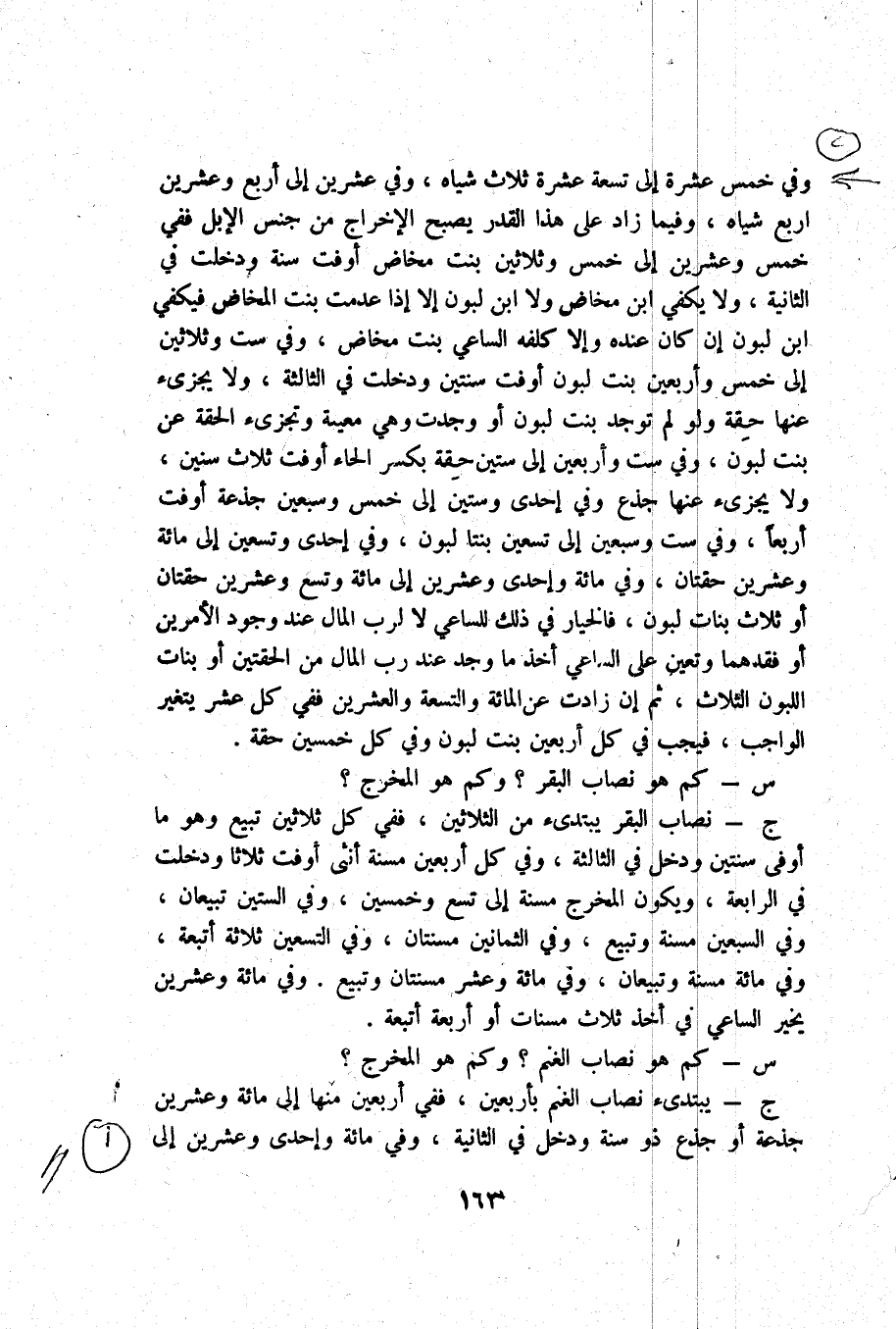 ج _ نِصَاب الْبَقر يَبْتَدِئ من الثَّلَاثِينَ فَفِي كل ثَلَاثِينَ تبيع وَهُوَ مَا أوفى سنتَيْن وَدخل فِي الثَّالِثَة وَفِي كل أَرْبَعِينَ مُسِنَّة أُنْثَى أوفت ثَلَاثًا وَدخلت فِي الرَّابِعَة وَيكون الْمخْرج مُسِنَّة إِلَى تسع وَخمسين وَفِي السِّتين تبيعان وَفِي السّبْعين مُسِنَّة وتبيع وَفِي الثَّمَانِينَ مسنتان وَفِي التسعين ثَلَاثَة أتبعة وَفِي مائَة مُسِنَّة وتبيعان وَفِي مائَة وَعشر مسنتان وتبيع