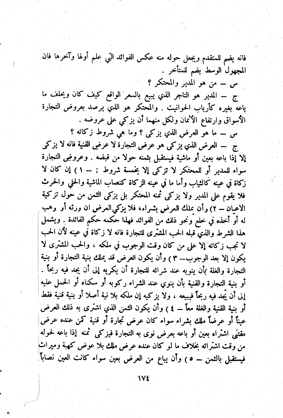وعروض التِّجَارَة سَوَاء للمدير أَو للمحتكر لَا تزكّى إِلَّا بِخَمْسَة شُرُوط 1) إِن كَانَ لَا زَكَاة فِي عينه كالثياب وَأما مَا فِي عينه الزَّكَاة كنصاب الْمَاشِيَة والحلي والحرث فَلَا يقوم على المدير وَلَا يزكّى ثمنه المحتكر بل يزكّى الثّمن من حول تَزْكِيَة الْأَعْيَان 2) وَأَن يملك الْعرض بشرَاء فَلَا يُزكي الْعرض أَن وَرثهُ أَو وهب لَهُ أَو أَخذه فِي خلع وَنَحْو ذَلِك من الْفَوَائِد فَهَذَا حكمه حكم الْفَائِدَة