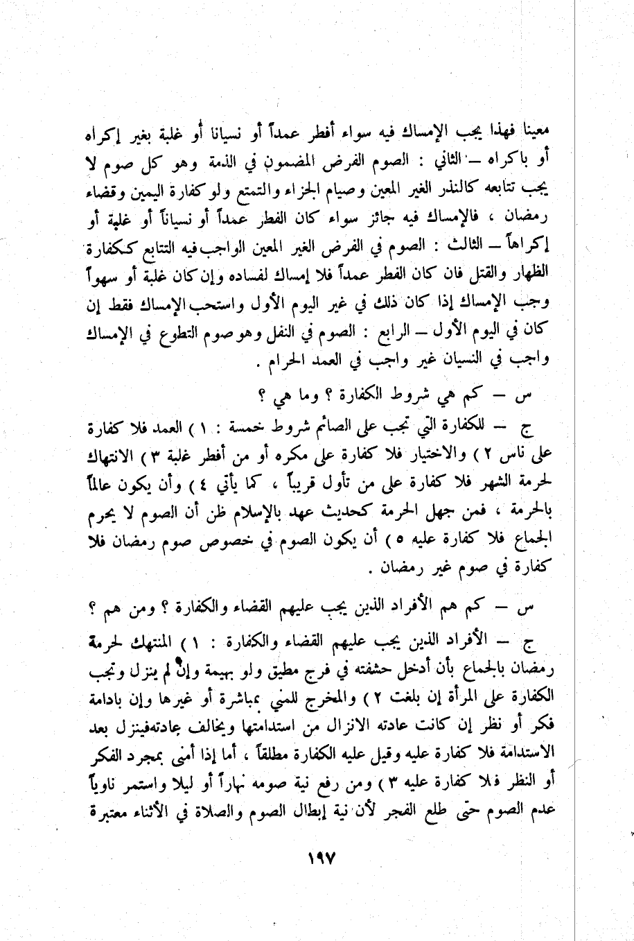 ج _ لِلْكَفَّارَةِ الَّتِي تجب على الصَّائِم شُرُوط خَمْسَة 1) الْعمد فَلَا كَفَّارَة على نَاس 2) والإختيار فَلَا كَفَّارَة على مكره أَو من أفطر غَلَبَة 3) الإنتهاك لحُرْمَة الشَّهْر فَلَا كَفَّارَة على من تَأَول قَرِيبا كَمَا يَأْتِي 4) وَأَن يكون عَالما بِالْحُرْمَةِ فَمن جهل الْحُرْمَة كَحَدِيث عهد بِالْإِسْلَامِ ظن أَن الصَّوْم لَا يحرم الْجِمَاع فَلَا كَفَّارَة عَلَيْهِ 5) أَن يكون الصَّوْم فِي خُصُوص صَوْم رَمَضَان فَلَا كَفَّارَة فِي صَوْم غير رَمَضَان