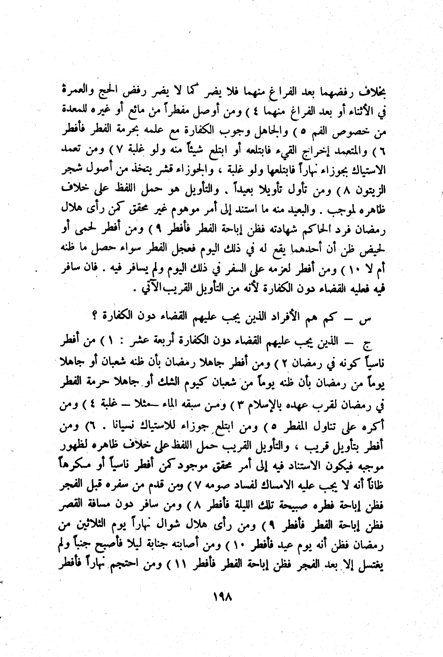ج _ الَّذين يجب عَلَيْهِم الْقَضَاء دون الْكَفَّارَة أَرْبَعَة عشر 1) من أفطر نَاسِيا كَونه فِي رَمَضَان 2) وَمن أفطر جَاهِلا رَمَضَان بِأَن ظَنّه شعْبَان أَو جَاهِلا يَوْمًا من رَمَضَان بِأَن ظَنّه يَوْمًا من شعْبَان كَيَوْم الشَّك أَو جَاهِلا حُرْمَة الْفطر فِي رَمَضَان لقرب عَهده بِالْإِسْلَامِ 3) وَمن سبقه المَاء مثلا غَلَبَة 4) وَمن أكره على تنَاول الْمُفطر 5) وَمن ابتلع جوزاء للإستياك نِسْيَانا 6) وَمن أفطر بِتَأْوِيل قريب والتأويل الْقَرِيب حمل اللَّفْظ على خلاف ظَاهره لظُهُور مُوجبه فَيكون الإستناد فِيهِ إِلَى أَمر مُحَقّق مَوْجُود كمن أفطر نَاسِيا أَو مكْرها ظَانّا أَنه لَا يجب عَلَيْهِ الْإِمْسَاك لفساد صَوْمه 7) وَمن قدم من سَفَره قبل الْفجْر فَظن إِبَاحَة فطره صَبِيحَة تِلْكَ اللَّيْلَة فَأفْطر 8) وَمن سَافر دون مَسَافَة الْقصر فَظن إِبَاحَة الْفطر فَأفْطر 9) وَمن رأى هِلَال شَوَّال نَهَارا يَوْم الثَّلَاثِينَ من رَمَضَان فَظن أَنه يَوْم عيد فَأفْطر 10) وَمن أَصَابَته جَنَابَة لَيْلًا فَأصْبح جنبا وَلم يغْتَسل إِلَّا بعد الْفجْر فَظن إِبَاحَة الْفطر فَأفْطر 11) وَمن احْتجم نَهَارا فَأفْطر