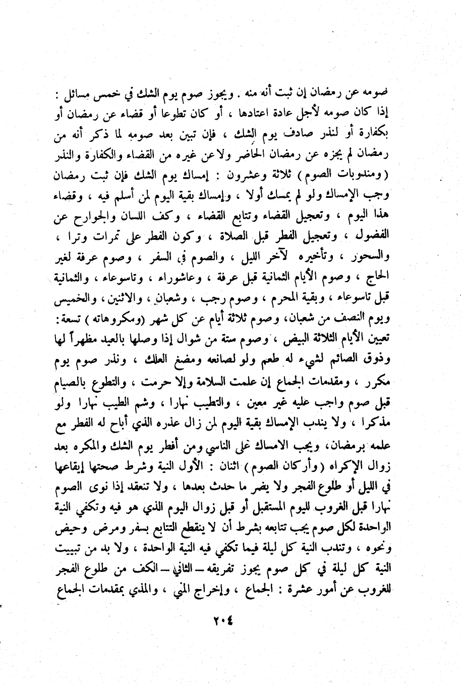 وَيجوز صَوْم يَوْم الشَّك فِي خمس مسَائِل إِذا كَانَ صَوْمه لأجل عَادَة إعتادها أَو كَانَ تَطَوّعا أَو قَضَاء عَن رَمَضَان أَو بكفارة أَو لنذر صَادف يَوْم الشَّك فَإِن تبين بعد صَوْمه لما ذكر أَنه من رَمَضَان لم يجزه عَن رَمَضَان الْحَاضِر وَلَا عَن غَيره من الْقَضَاء وَالْكَفَّارَة وَالنّذر ومندوبات الصَّوْم ثَلَاثَة وَعِشْرُونَ إمْسَاك يَوْم الشَّك فَإِن ثَبت رَمَضَان وَجب الْإِمْسَاك وَلَو لم يمسك أَولا وإمساك بَقِيَّة الْيَوْم لمن أسلم فِيهِ وَقَضَاء هَذَا الْيَوْم وتعجيل الْقَضَاء وتتابع الْقَضَاء وكف اللِّسَان والجوارح عَن الفضول وتعجيل الْفطر قبل الصَّلَاة وَكَون الْفطر على تمرات وترا والسحور وتأخيره لآخر اللَّيْل وَالصَّوْم فِي السّفر وَصَوْم عَرَفَة لغير الْحَاج وَصَوْم الْأَيَّام الثَّمَانِية قبل عَرَفَة وعاشوراء وتاسوعاء وَالثَّمَانِيَة قبل تاسوعاء وَبَقِيَّة الْمحرم وَصَوْم رَجَب وَشَعْبَان والاثنين وَالْخَمِيس وَيَوْم النّصْف من شعْبَان وَصَوْم ثَلَاثَة أَيَّام عَن كل شهر ومكروهاته تِسْعَة تعْيين الْأَيَّام الثَّلَاثَة الْبيض وَصَوْم سِتَّة من شَوَّال إِذا وَصلهَا بالعيد مظْهرا لَهَا وذوق الصَّائِم لشَيْء لَهُ طعم وَلَو لصانعه ومضغ العلك وَنذر صَوْم يَوْم مُكَرر ومقدمات الْجِمَاع إِن علمت السَّلامَة وَإِلَّا حرمت والتطوع بالصيام قبل صَوْم وَاجِب عَلَيْهِ غير معِين والتطيب نَهَارا وشم الطّيب نَهَارا وَلَو مذكرا وَلَا ينْدب الْإِمْسَاك بَقِيَّة الْيَوْم لمن زَالَ عذره الَّذِي أَبَاحَ لَهُ الْفطر مَعَ علمه برمضان وَيجب الْإِمْسَاك على النَّاسِي وَمن أفطر يَوْم الشَّك وَالْمكْره بعد زَوَال الْإِكْرَاه وأركان الصَّوْم اثْنَان الأول النِّيَّة وَشرط صِحَّتهَا إيقاعها فِي اللَّيْل أَو طُلُوع الْفجْر وَلَا يضر مَا حدث بعْدهَا وَلَا تَنْعَقِد إِذا نوى الصَّوْم نَهَارا قبل الْغُرُوب لليوم الْمُسْتَقْبل أَو قبل زَوَال الْيَوْم الَّذِي هُوَ فِيهِ وتكفي النِّيَّة الْوَاحِدَة لكل صَوْم يجب تتابعه بِشَرْط أَن لَا يَنْقَطِع التَّتَابُع بسفر وَمرض وحيض وَنَحْوه وتندب النِّيَّة كل لَيْلَة فِيمَا تَكْفِي فِيهِ النِّيَّة الْوَاحِدَة وَلَا بُد من تبييت النِّيَّة كل لَيْلَة فِي كل صَوْم يجوز تفريقه الثَّانِي الْكَفّ من طُلُوع الْفجْر للغروب عَن أُمُور عشرَة الْجِمَاع وَإِخْرَاج الْمَنِيّ والمذي بمقدمات الْجِمَاع