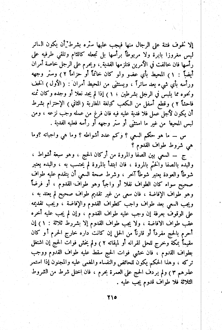 ج _ السَّعْي بَين الصَّفَا والمروة من أَرْكَان الْحَج وَهُوَ سَبْعَة أَشْوَاط والبدء بالصفا والختم بالمروة فَإِن ابْتَدَأَ بالمروة لم يحْتَسب بِهِ والبدء يعْتَبر شوطا والعودة يعْتَبر شوطا آخر وَشرط صِحَة السَّعْي أَن يتَقَدَّم عَلَيْهِ طواف صَحِيح سَوَاء كَانَ الطّواف نفلا أَو وَاجِبا وَهُوَ طواف الْقدوم أَو فرضا وَهُوَ طواف الْإِفَاضَة فَإِن سعى من غير تَقْدِيم طواف صَحِيح لم يعْتد بِهِ وَيجب السَّعْي بعد طواف وَاجِب كطواف الْقدوم والإفاضة وَيجب تَقْدِيمه على الْوُقُوف بِعَرَفَة إِن وَجب عَلَيْهِ طواف الْقدوم وَإِن لم يجب عَلَيْهِ أَخّرهُ عقب طواف الْإِفَاضَة وَلَا يجب طواف الْقدوم إِلَّا بِشُرُوط ثَلَاثَة 1) إِن أحرم بِالْحَجِّ مُفردا أَو قَارنا من الْحل إِن كَانَت دَاره خَارج الْحرم أَو كَانَ مُقيما بِمَكَّة وَخرج للْحلّ لقرانه أَو لميقاته 2) وَلم يخْش فَوَات الْحَج إِن اشْتغل بِطواف الْقدوم فَإِن خشِي فَوَات الْحَج سقط عَلَيْهِ طواف الْقدوم وَوَجَب تَركه وَهَذَا الحكم يكون للحائض وَالنُّفَسَاء والمغمى عَلَيْهِ وَالْمَجْنُون إِذا اسْتمرّ عذرهمْ 3) وَلم يردف الْحَج على الْعمرَة بحرم فَإِن اخْتَلَّ شَرط من الشُّرُوط الثَّلَاثَة فَلَا طواف قدوم يجب عَلَيْهِ