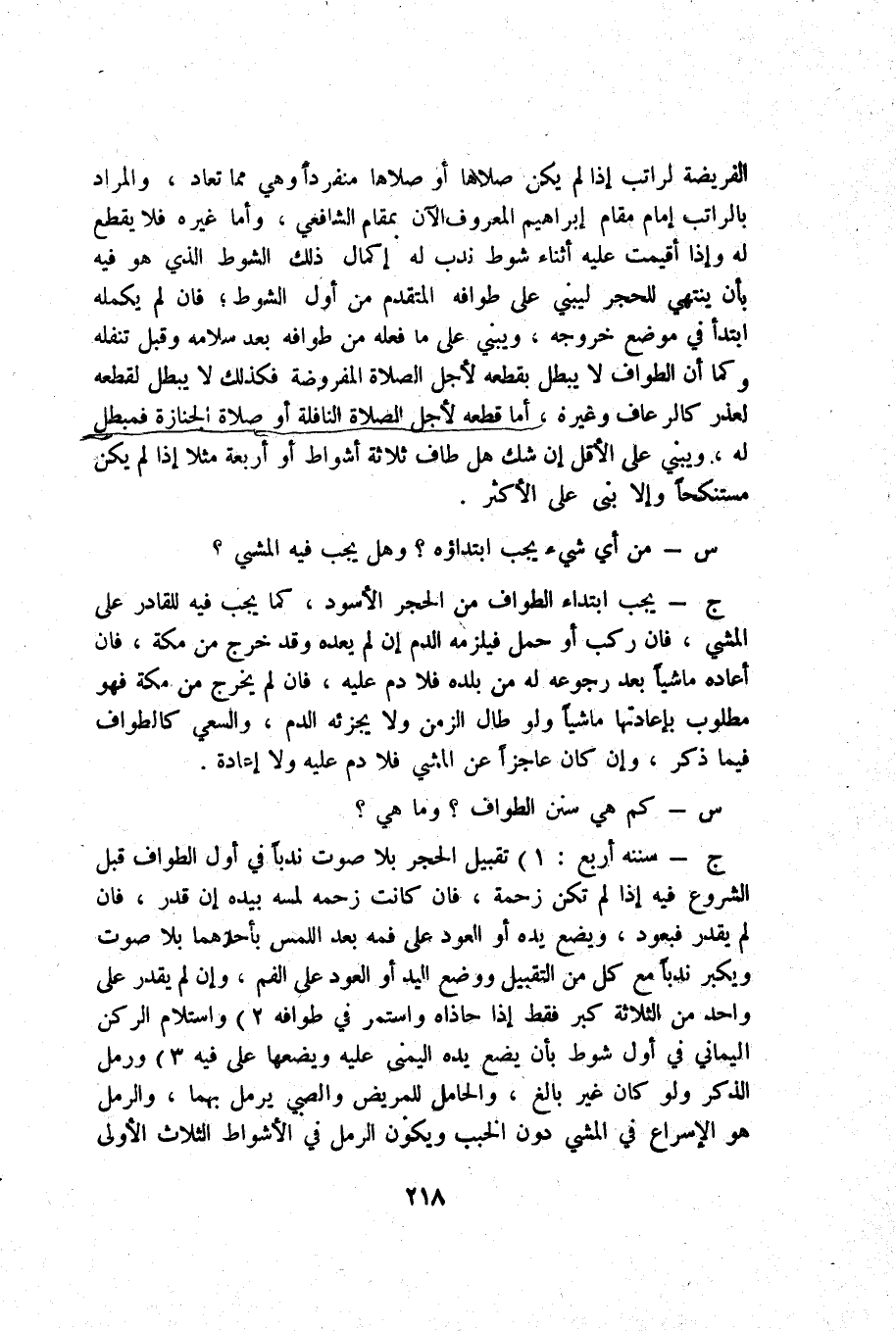 الْفَرِيضَة لراتب إِذا لم يكن صلاهَا أَو صلاهَا مُنْفَردا وَهِي مِمَّا تُعَاد وَالْمرَاد بالراتب إِمَام مقَام إِبْرَاهِيم الْمَعْرُوف الْآن بمقام الشَّافِعِي وَأما غَيره فَلَا يقطع لَهُ وَإِذا أُقِيمَت عَلَيْهِ أثْنَاء شوط ندب لَهُ إِكْمَال ذَلِك الشوط الَّذِي هُوَ فِيهِ بِأَن يَنْتَهِي للحجر ليبني على طَوَافه الْمُتَقَدّم من أول الشوط فَإِن لم يكمله ابْتَدَأَ فِي مَوضِع خُرُوجه وَيَبْنِي على مَا فعله من طَوَافه بعد سَلَامه وَقبل تنفله وكما أَن الطّواف لَا يبطل بِقطعِهِ لأجل الصَّلَاة الْمَفْرُوضَة فَكَذَلِك لَا يبطل لقطعه لعذر كالرعاف وَغَيره أما قطعه لأجل الصَّلَاة النَّافِلَة أَو صَلَاة الْجِنَازَة فمبطل لَهُ وَيَبْنِي على الْأَقَل إِن شكّ هَل طَاف ثَلَاثَة أَشْوَاط أَو أَرْبَعَة مثلا إِذا لم يكن مستنكحا وَإِلَّا بنى على الْأَكْثَر