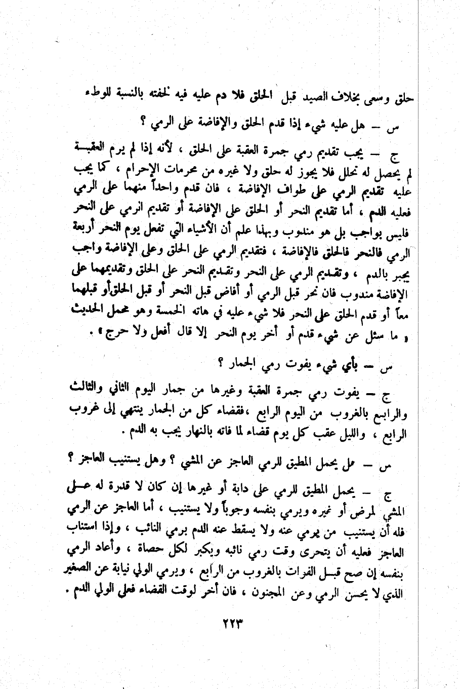 ج _ يجب تَقْدِيم رمي جَمْرَة الْعقبَة على الْحلق لِأَنَّهُ إِذا لم يرم الْعقبَة لم يحصل لَهُ تحلل فَلَا يجوز لَهُ حلق وَلَا غَيره من مُحرمَات الْإِحْرَام كَمَا يجب عَلَيْهِ تَقْدِيم الرَّمْي على طواف الْإِفَاضَة فَإِن قدم وَاحِدًا مِنْهُمَا على الرَّمْي فَعَلَيهِ الدَّم أما تَقْدِيم النَّحْر أَو الْحلق على الْإِفَاضَة أَو تَقْدِيم الرَّمْي على النَّحْر فَلَيْسَ بِوَاجِب بل هُوَ مَنْدُوب وَبِهَذَا علم أَن الْأَشْيَاء الَّتِي تفعل يَوْم النَّحْر أَرْبَعَة الرَّمْي فالنحر فالحلق فالإفاضة فتقديم الرَّمْي على الْحلق وعَلى الْإِفَاضَة وَاجِب يجْبر بِالدَّمِ وَتَقْدِيم الرَّمْي على النَّحْر وَتَقْدِيم النَّحْر على الْحلق وتقديمهما على الْإِفَاضَة مَنْدُوب فَإِن نحر قبل الرَّمْي أَو أَفَاضَ قبل النَّحْر أَو قبل الْحلق أَو قبلهمَا مَعًا أَو قدم الْحلق على النَّحْر فَلَا شَيْء عَلَيْهِ فِي هاته الْخَمْسَة وَهُوَ محمل الحَدِيث مَا سُئِلَ عَن شَيْء قدم أَو أخر يَوْم النَّحْر إِلَّا قَالَ أفعل وَلَا حرج