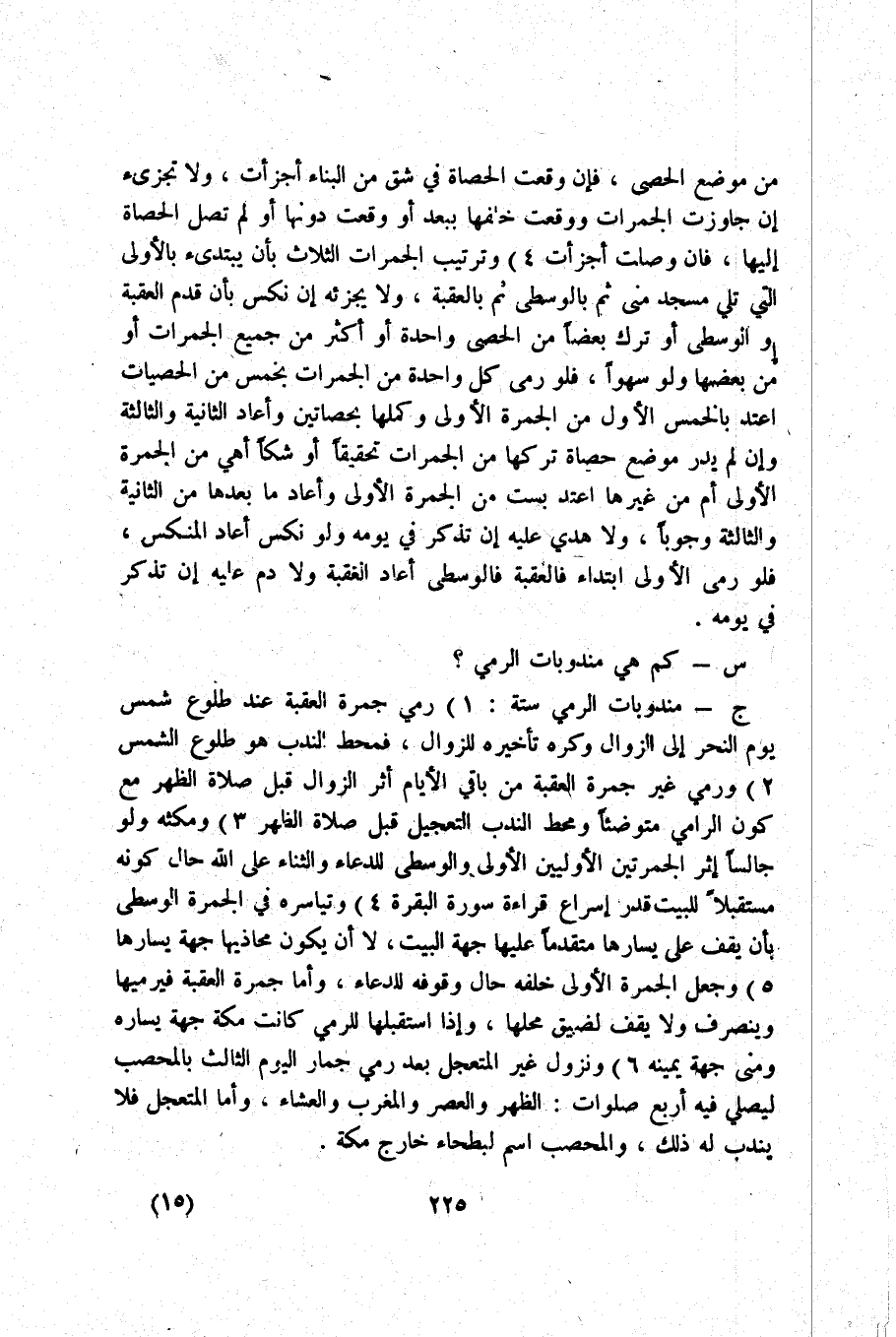 ج _ مندوبات الرَّمْي سِتَّة) رمي جَمْرَة الْعقبَة عِنْد طُلُوع شمس يَوْم النَّحْر إِلَى الزَّوَال وَكره تَأْخِيره للزوال فمحط النّدب هُوَ طُلُوع الشَّمْس 2) وَرمي غير جَمْرَة الْعقبَة من بَاقِي الْأَيَّام أثر الزَّوَال قبل صَلَاة الظّهْر مَعَ كَون الرَّامِي متوضئا ومحط النّدب التَّعْجِيل قبل صَلَاة الظّهْر 3) ومكثه وَلَو جَالِسا إِثْر الْجَمْرَتَيْن الْأَوليين الأولى وَالْوُسْطَى للدُّعَاء وَالثنَاء على الله حَال كَونه مُسْتَقْبلا للبيت قدر إسراع قِرَاءَة سُورَة الْبَقَرَة 4) وتياسره فِي الْجَمْرَة الْوُسْطَى بِأَن يقف على يسارها مُتَقَدما عَلَيْهَا جِهَة الْبَيْت لَا أَن يكون محاذيها جِهَة يسارها 5) وَجعل الْجَمْرَة الأولى خَلفه حَال وُقُوفه للدُّعَاء وَأما جَمْرَة الْعقبَة فيرميها وينصرف وَلَا يقف لضيق محلهَا وَإِذا اسْتَقْبلهَا للرمي كَانَت مَكَّة جِهَة يسَاره وَمنى جِهَة يَمِينه 6) ونزول غير المتعجل بعد رمي جمار الْيَوْم الثَّالِث بالمحصب ليُصَلِّي فِيهِ أَربع صلوَات الظّهْر وَالْعصر وَالْمغْرب وَالْعشَاء وَأما المتعجل فَلَا ينْدب لَهُ ذَلِك والمحصب اسْم لبطحاء خَارج مَكَّة