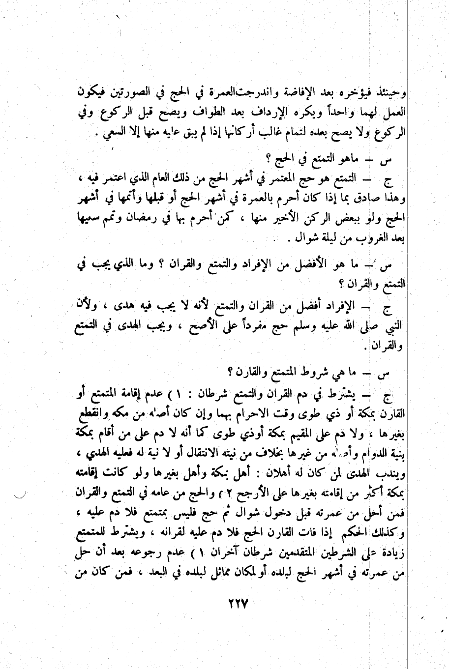 ج _ يشْتَرط فِي دم الْقرَان والتمتع شَرْطَانِ 1) عدم إِقَامَة الْمُتَمَتّع أَو الْقَارِن بِمَكَّة أَو ذِي طوى وَقت الْإِحْرَام بهما وَإِن كَانَ أَصله من مَكَّة وَانْقطع بغَيْرهَا وَلَا دم على الْمُقِيم بِمَكَّة أَو ذِي طوى كَمَا أَنه لَا دم على من أَقَامَ بِمَكَّة بنية الدَّوَام وَأَصله من غَيرهَا بِخِلَاف من نِيَّته الإنتقال أَو لَا نِيَّة لَهُ فَعَلَيهِ الْهَدْي وَينْدب الْهدى لمن كَانَ لَهُ أهلان أهل بِمَكَّة وَأهل بغَيْرهَا وَلَو كَانَت إِقَامَته بِمَكَّة أَكثر من إِقَامَته بغَيْرهَا على الْأَرْجَح 2) وَالْحج من عَامه فِي التَّمَتُّع وَالْقرَان فَمن أحل من عمرته قبل دُخُول شَوَّال ثمَّ حج فَلَيْسَ بمتمتع فَلَا دم عَلَيْهِ وَكَذَلِكَ الحكم إِذا فَاتَ الْقَارِن الْحَج فَلَا دم عَلَيْهِ لقرانه وَيشْتَرط للممتنع زِيَادَة على الشَّرْطَيْنِ الْمُتَقَدِّمين شَرْطَانِ آخرَانِ 1) عدم رُجُوعه بعد أَن حل من عمرته فِي أشهر الْحَج لبلده أَو لمَكَان مماثل لبلده فِي الْبعد فَمن كَانَ من